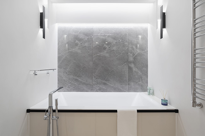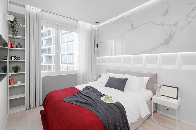Работая над 3D-визуализацией, авторы обсуждали несколько видов натурального камня для разных помещений, в гостевом санузле остановились на ярко-красном мраморе. Впоследствии оказалось, что его невозможно привезти в Россию. В итоге нашли выход: с помощью графического дизайнера воспроизвели рисунок этого мрамора в большом формате и распечатали на стекле. Получилось глубокое изображение, которое стало альтернативой натуральному камню.