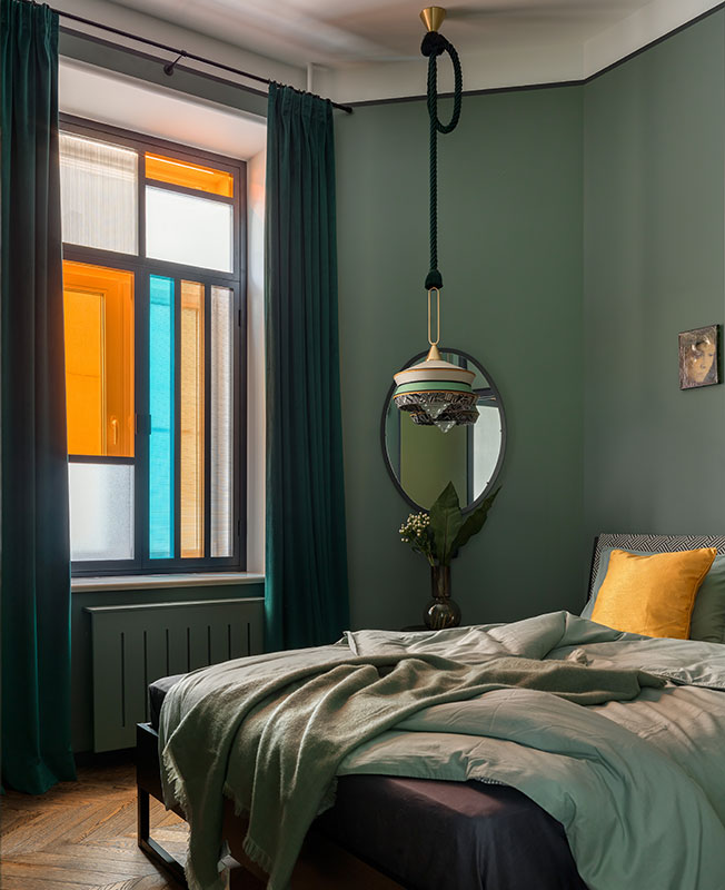 Дмитрий Кузнецов и Наталья Воробьева оформили интерьер московской квартиры для временного проживания для Нади Котовой-Массен — бельгийской галеристки с русскими корнями, которая выставляет в своей NK Gallery российских художников. В спальне витраж по эскизам дизайнеров изготовлен мастерской Jila.