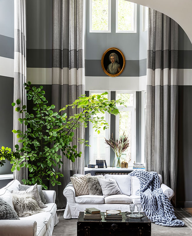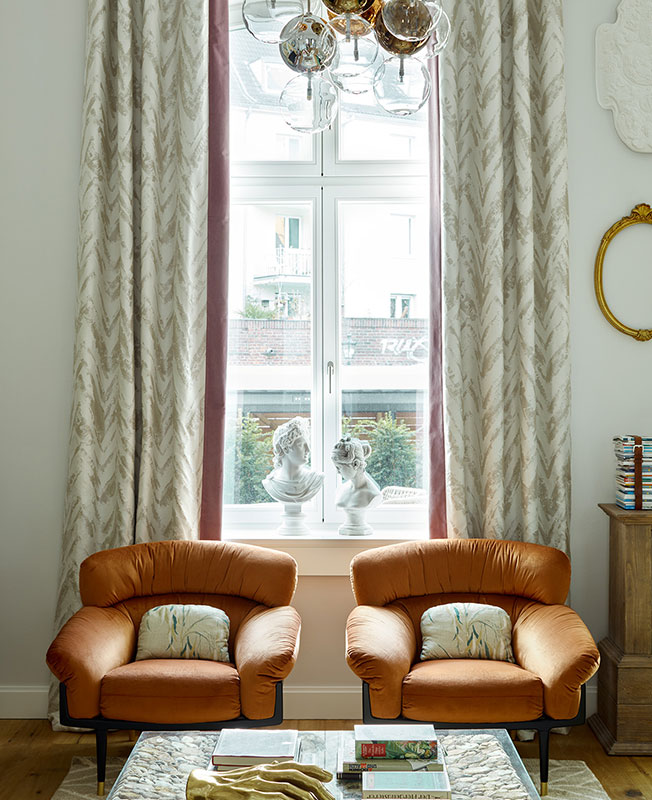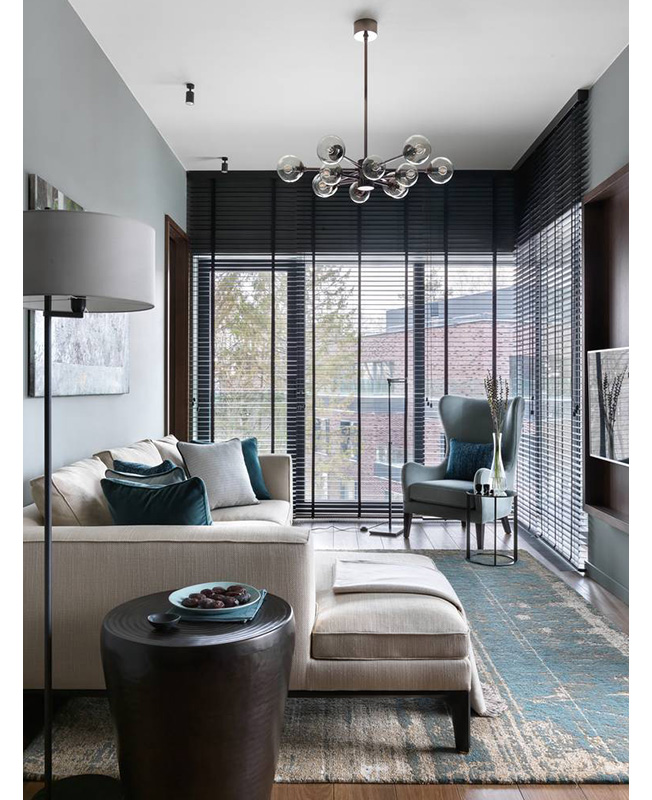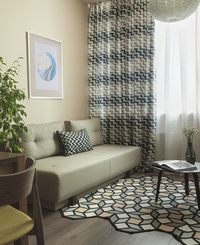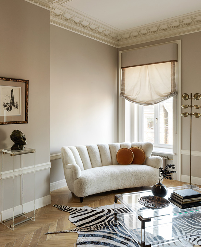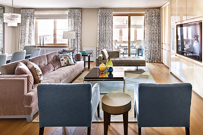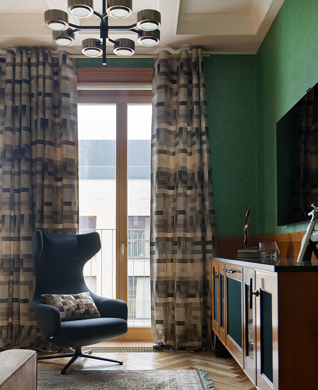 Проект Наташи Ткачук — квартира в Филипповском переулке — выдержан в единой цветовой гамме, благородной и актуальной. На окнах в гостиной шторы из шелка Zinс c деликатным графичным орнаментом.