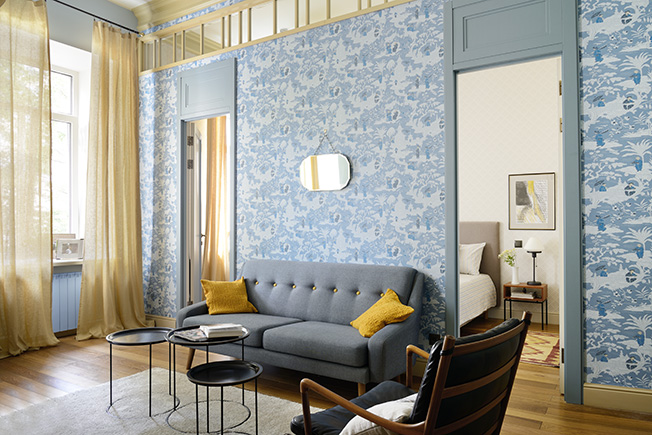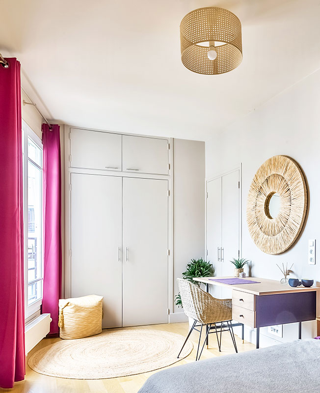 Проект Neva Interior Design — квартира площадью 47 кв. метров в Париже. Ставку сделали на стилистику ретро-поп. Винтажный образ добавил необходимое тепло и свет в холодные краски. Ударные акценты — шторы оттенка фуксии в спальне.