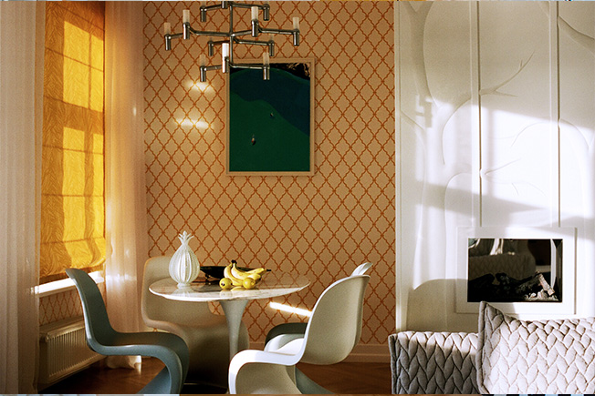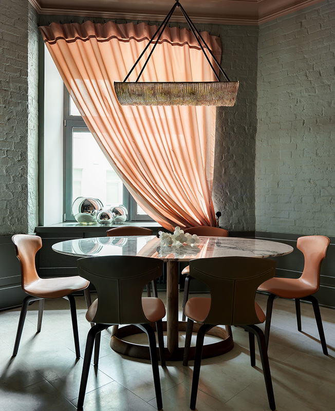 Елена Дроботова cпроектировала квартиру в историческом центре Москвы. Дизайнер удачно соединила старую архитектуру с современными технологиями и запросами новых владельцев. Карниз оттенка «увядшей розы» — идея скульптора Игоря Мошкина. Цвет гармонирует с тканью штор и кожаной обивкой стульев.