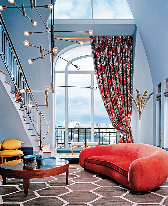 Бритт Моран и Эмильяно Сальчи устроились в Париже как модные итальянцы. Ярко, неожиданно и красиво. Тон в двухсветной гостиной задает огромное окно с историческим переплетом. Торшер-пальма, диз. А. Лелли, — любимый объект хозяев. Под него подобрана ткань шторы.