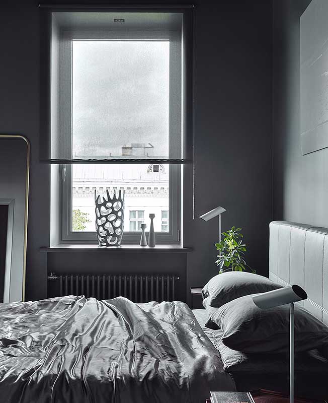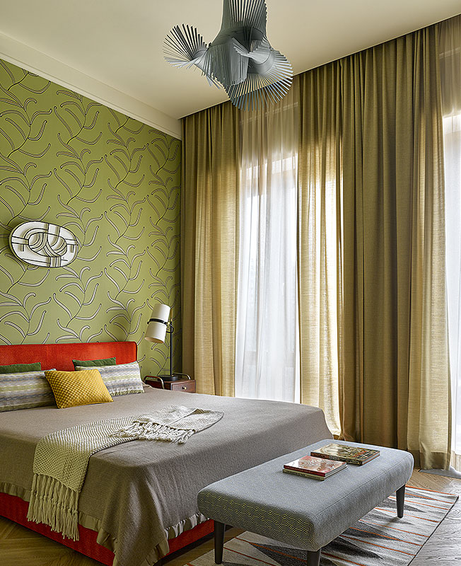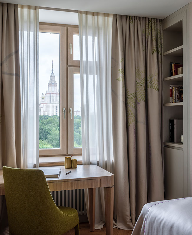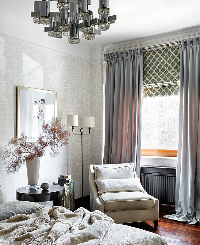 Квартира в Хамовниках — проект студии Porte Rouge. Ирина Малышкина и Наталья Леонова кардинально обновили свой же интерьер, над которым работали 17 лет назад. В спальне шторы из текстиля Kravet.