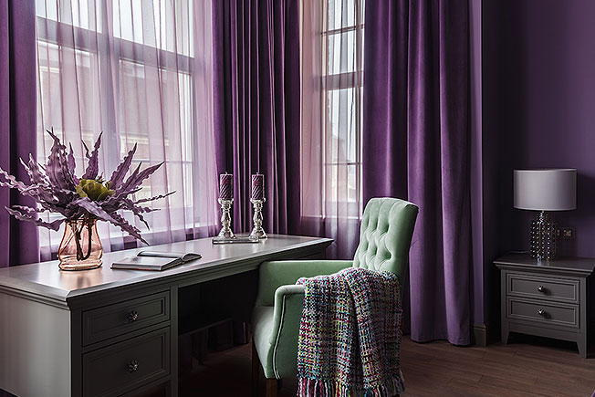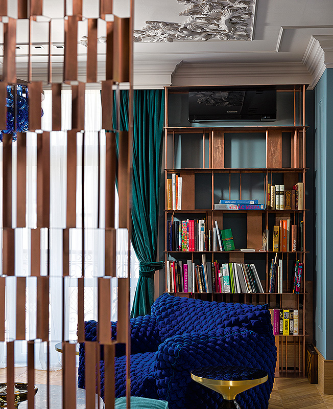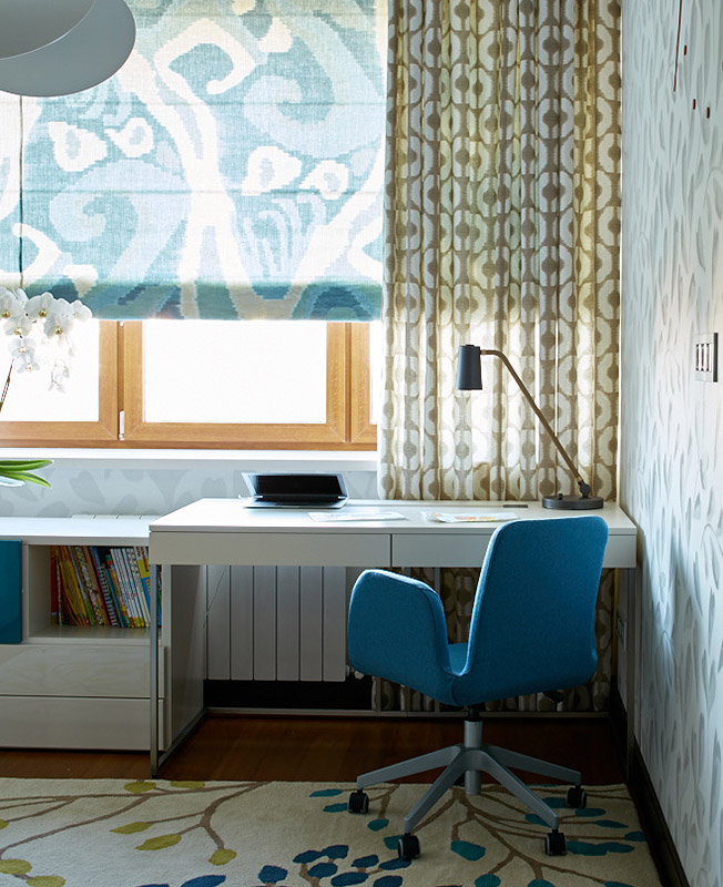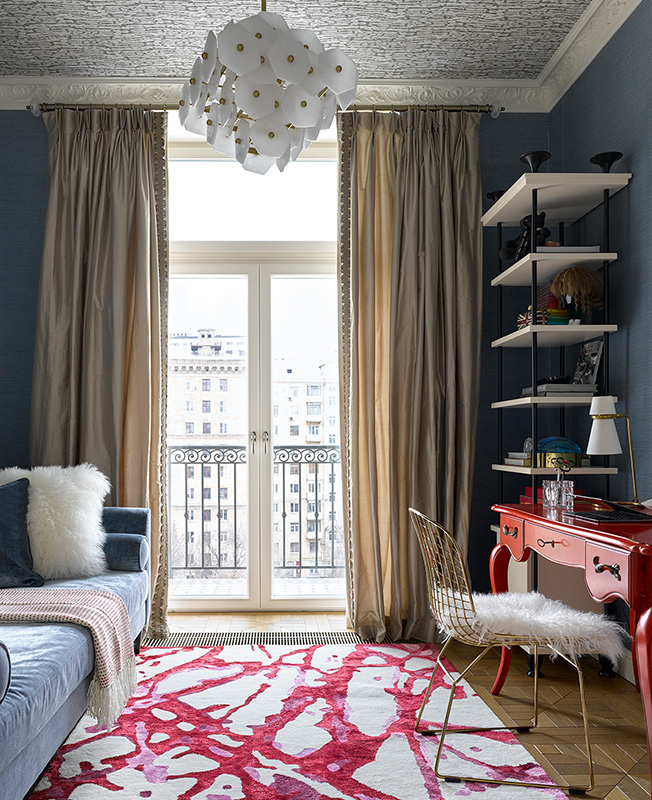Ирина Бдайциева завершила проект в жилом комплексе «Литератор». Дизайнер объединила две смежные квартиры, создав пространство в 250 кв. метров. Кабинет — единственная комната, где использованы насыщенные краски. Портьеры и декоративные подушки из ткани Osborne & Little, пошив Marilux.