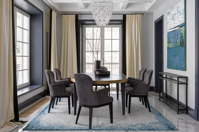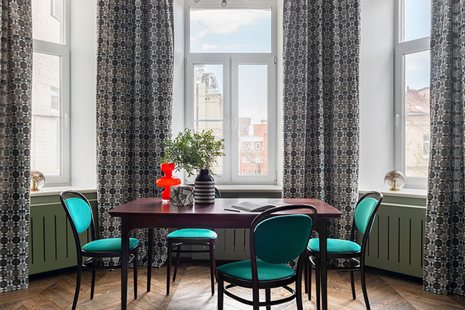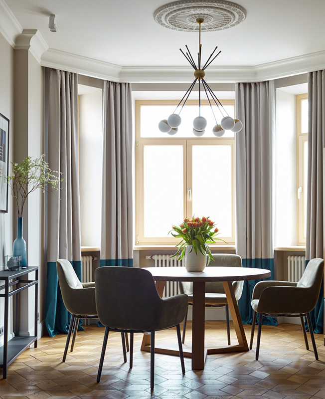 Дмитрий Кузнецов и Наталья Воробьева оформили интерьер московской квартиры для временного проживания для Нади Котовой-Массен — бельгийской галеристки с русскими корнями, которая выставляет в своей NK Gallery российских художников. В зоне столовой портьеры Safeco France.