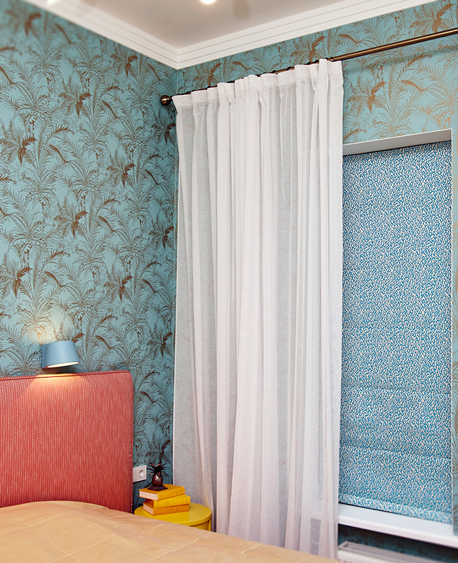 Дизайнер Ольга Зубова, оборудовала на площади 120 кв. метров личное пространство для каждого члена семьи с двумя детьми. В спальне девочки — шторы с росписью ручной работы.