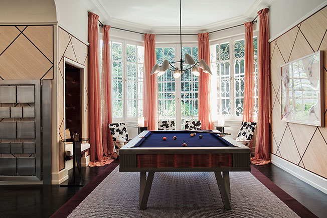 Робер Кутюрье декорировал классическую виллу под Зальцбургом. Биллиардная расположена в эркере. Шторы цвета лососины сочетаются с синим сукном, на которое заменили традиционное зеленое. Бежевая гамма обогащена природными фактурами на стенах.