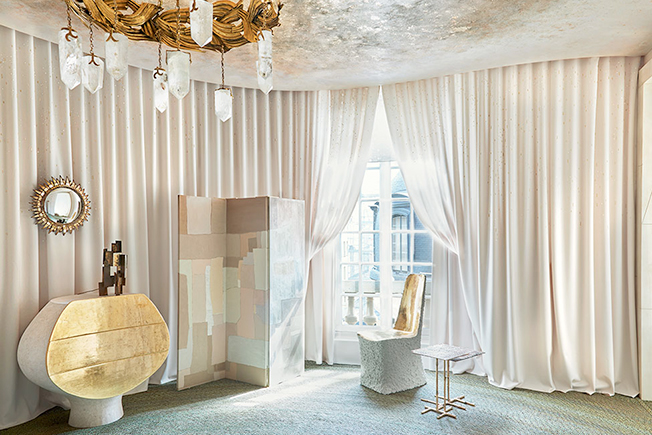 Декоратор Анн-Софи Пайере перенесла зрителя в мир высокой моды. Она трактовала интерьер как футляр для ювелирных украшений. На драпировки пошло 107 метров шерсти и кашемира, вручную расшитых перламутром и золотой нитью — работа заняла 16 недель.