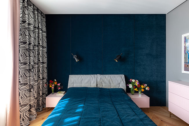 Дизайнер Влада Махно завершила квартиру в киевском ЖК «Новопечерские липки». Спальня очаровывает небанальной палитрой: глубокий «морской» синий сочетается с легким розовым и черно-белой графикой.