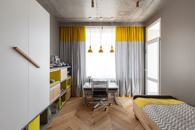 Квартира в киевском ЖК «Новопечерские липки» — проект дизайнера Влады Махно. Комнату сына определяет сочетание серого и желтого.