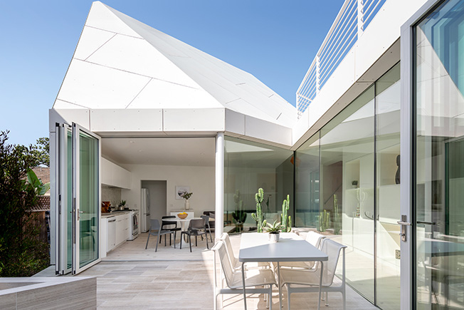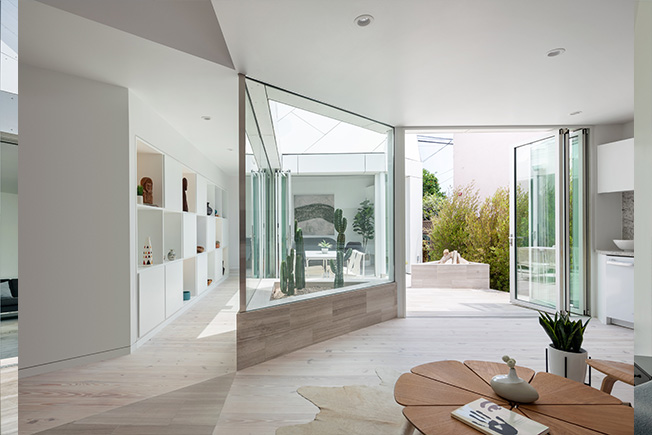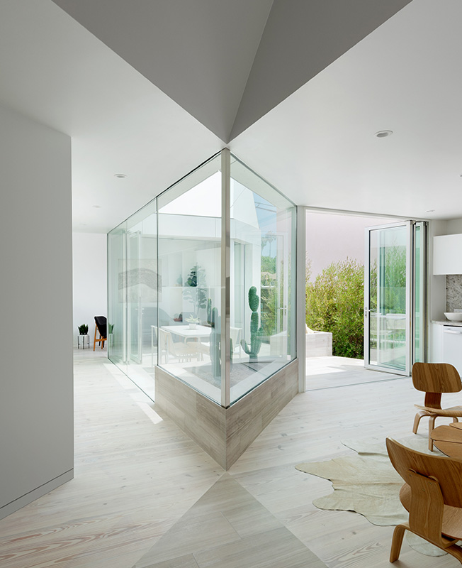 Каждая комната дома — это отдельный блок с видом на внутренний двор, открытый во внешнее пространство. Переходы, коридоры и пороги соединяют ряд совершенно разные интерьеры, которые интегрированы в единую среду.