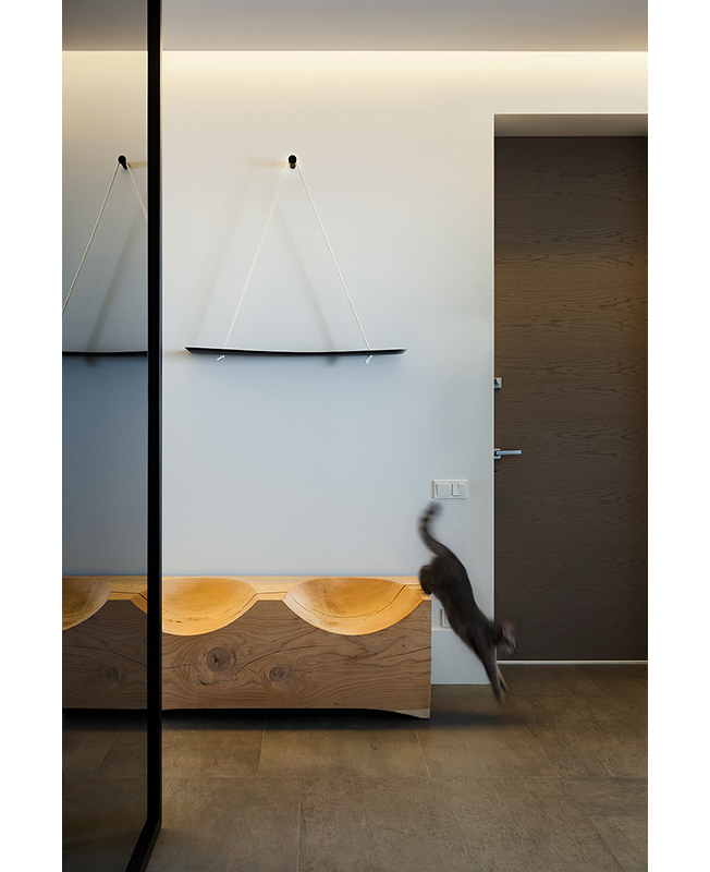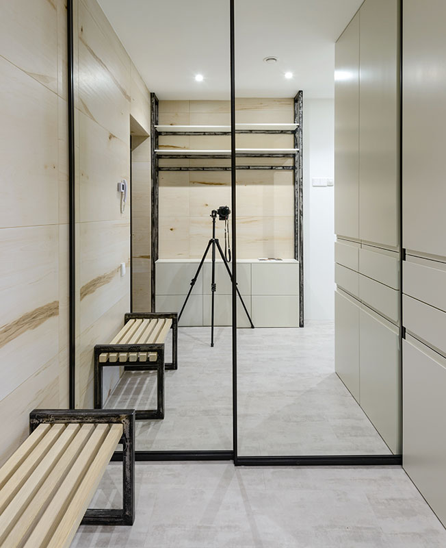 Дизайнер Рина Ловко, Rina Lovko Design спроектировала квартиру площадью 200 кв. метров в Киеве, на двадцатом этаже с видом на Днепр. Холл украшает скамьй из кедра от Riva 1920.