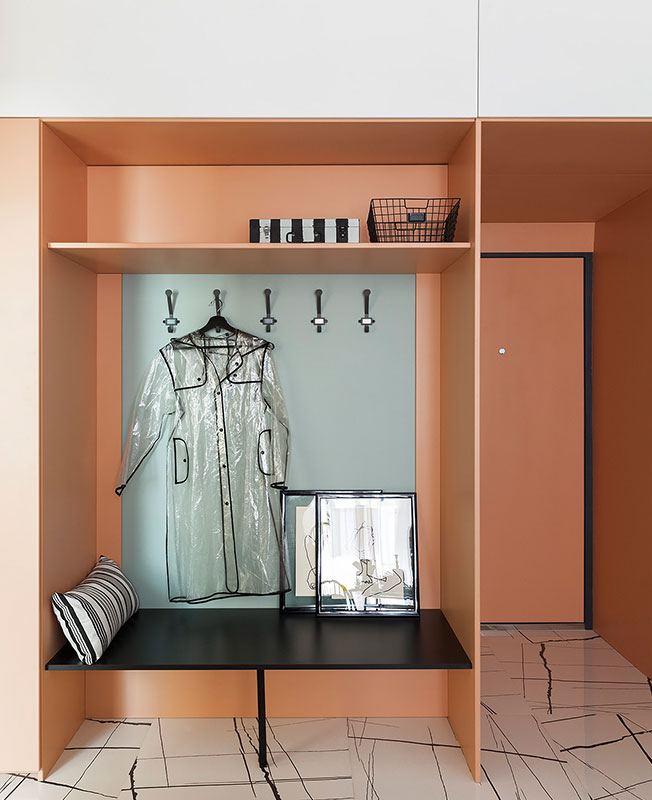Квартира площадью 160 кв. метров находится в новом доме, в Москве. Дарья Белякова и архитекторы Алексей Борисов и Ксения Караваева, студия ARCH(E)TYPE, назвали этот свой проект «Цвет граната». В прихожей красная скамейка Archipelago.