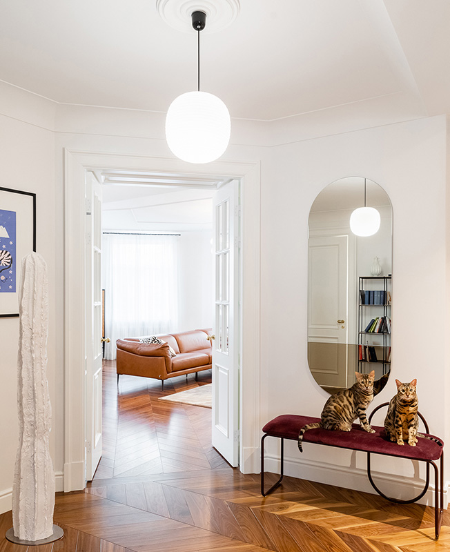Дизайнеры Ариана Ахмад и Татьяна Карякина спроектировали квартиру в доме, расположенном в тихих московских переулках, в Хамовниках. Шкаф и скамья в прихожей изготовлены на заказ по эскизам дизайнеров.