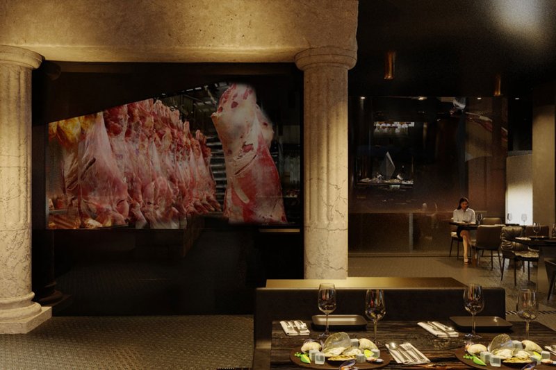 Ресторан включает открытый общий зал, в котором уединенные места практически отсутствуют. Здесь оборудован гриль, мангал и открытая зона с разделкой рыбы. Мясо поместили в отдельную комнату с окном — помещение напоминает лабораторию. Также в «мясной» зоне предусмотрели специальный шеф-стол для готовки.