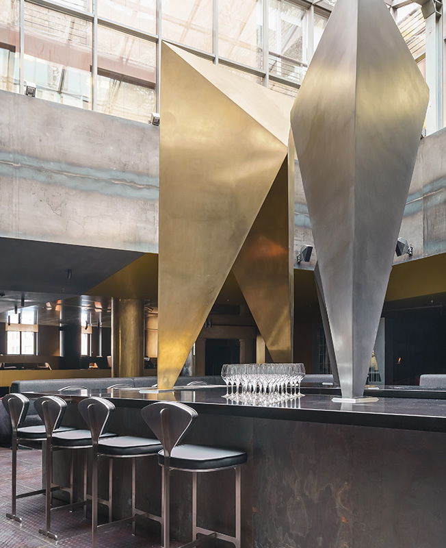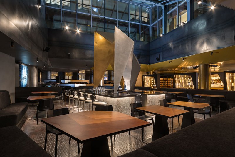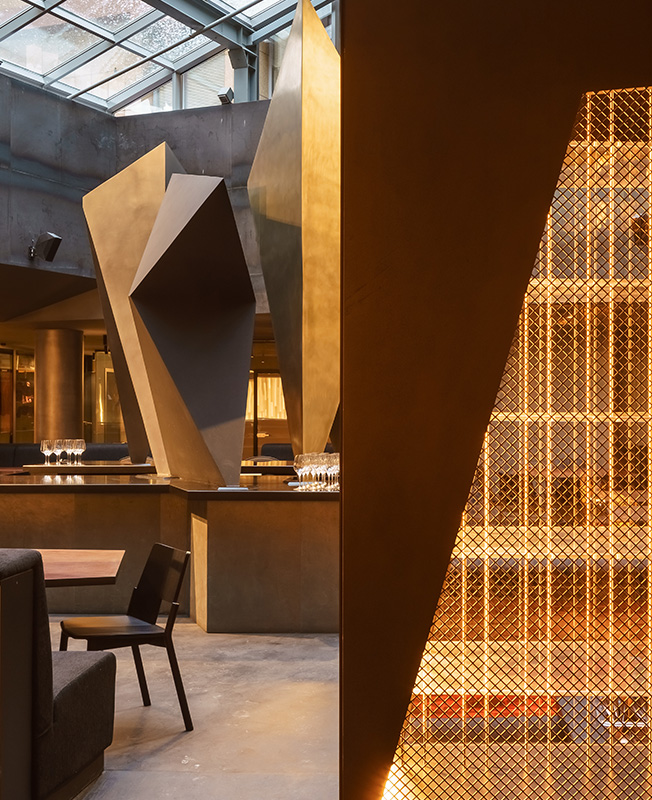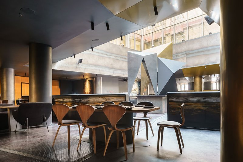 В интерьере ресторана Selection архитекторы добились сбалансированного контраста между угловатыми конструкциями и уютной обстановкой, брутальными холодными поверхностями и теплыми материалами.