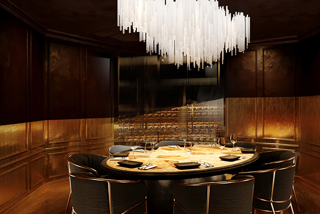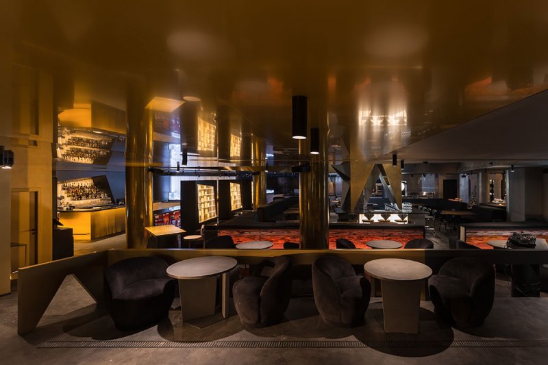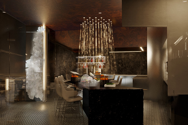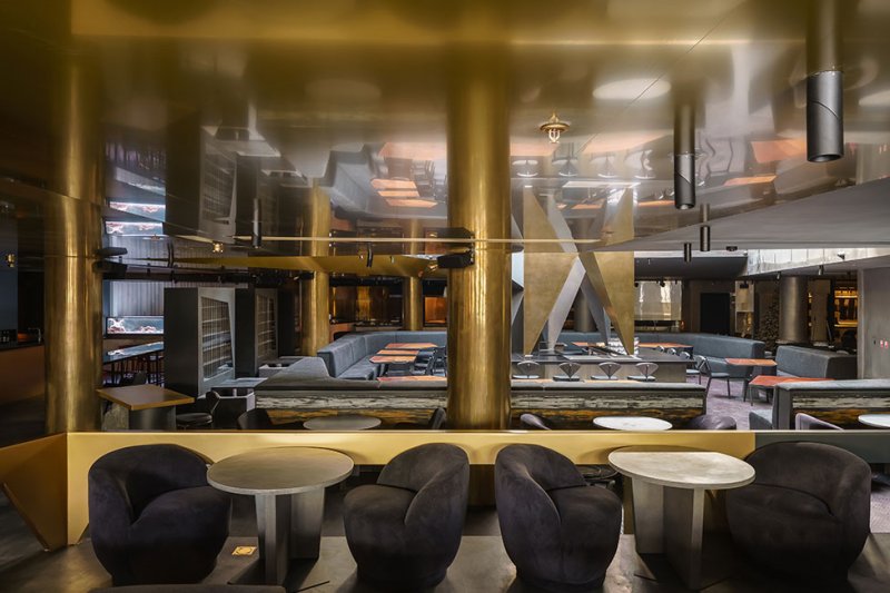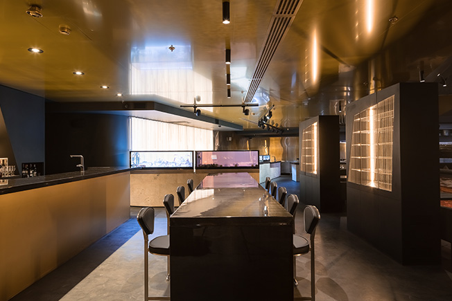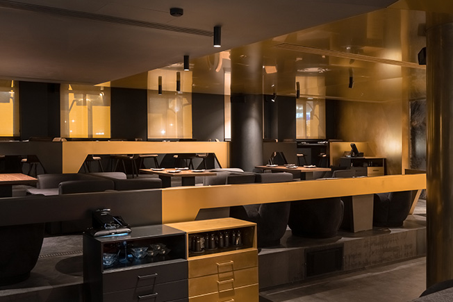 Эффектным решением стало использование отражающих поверхностей. Столешницы из карбона с глянцевым лаком сочетаются с нержавеющим полированным металлом. Также в интерьере применили специальный спектр освещения, который учитывает технологии приготовления мяса и рыбы.