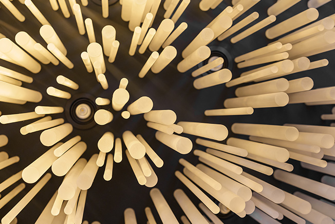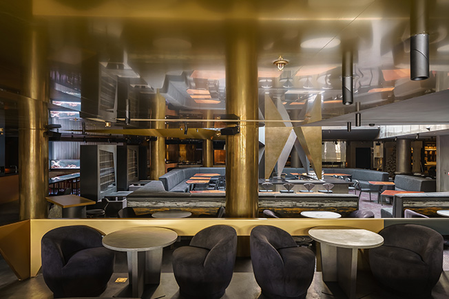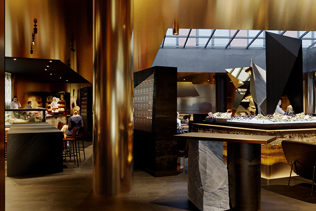 Зоны продуктов выделены и разграничены с помощью цвета: «золото» для рыбы и «серебро» для мяса. Центром всего пространства стали эффектные массивные конструкции, напоминающие театральные декорации. Угловатый силуэт инсталляций продиктован самой формой помещения.