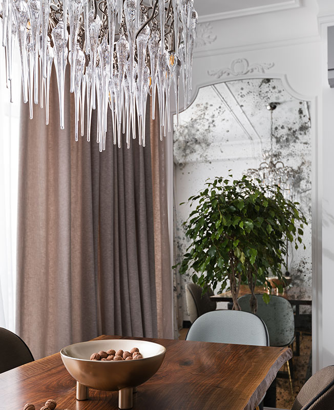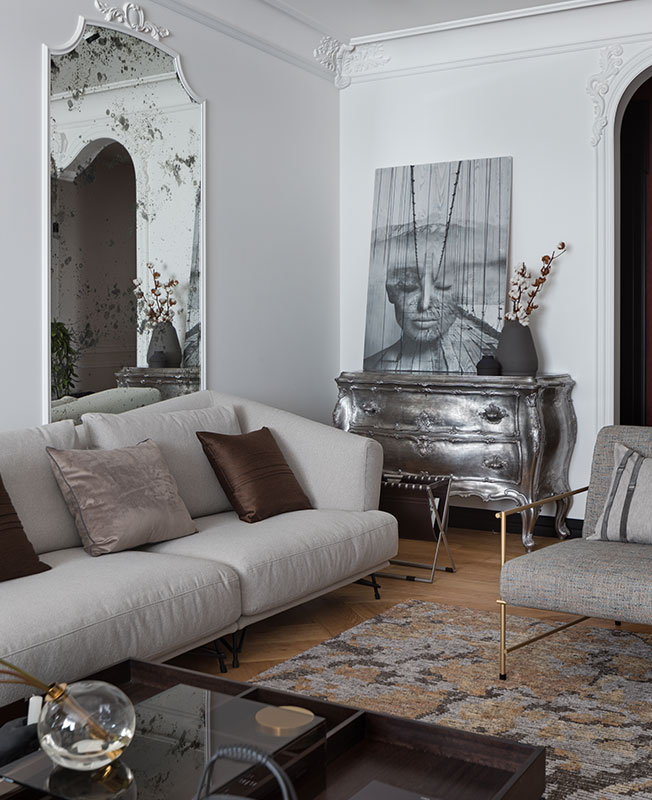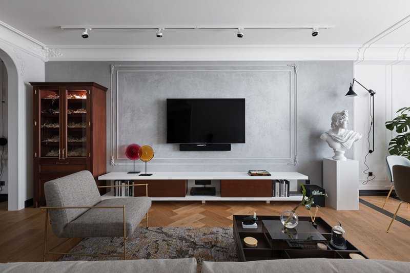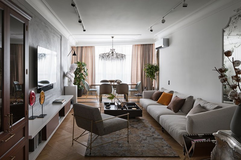 Стены в гостиной оформили с фактурой под бетон и дополнили лепниной ручной работы. Поддерживают атмосферу античности состаренное зеркало и винтажный комод в гостиной. В отделке также использовали паркет нескольких видов: цвета палубной доски и ели для визуального зонирования.