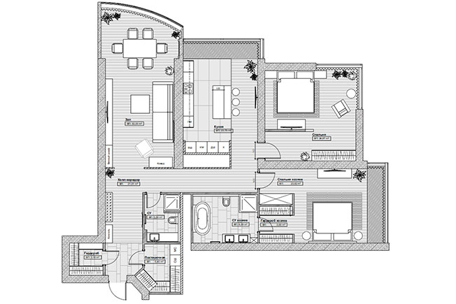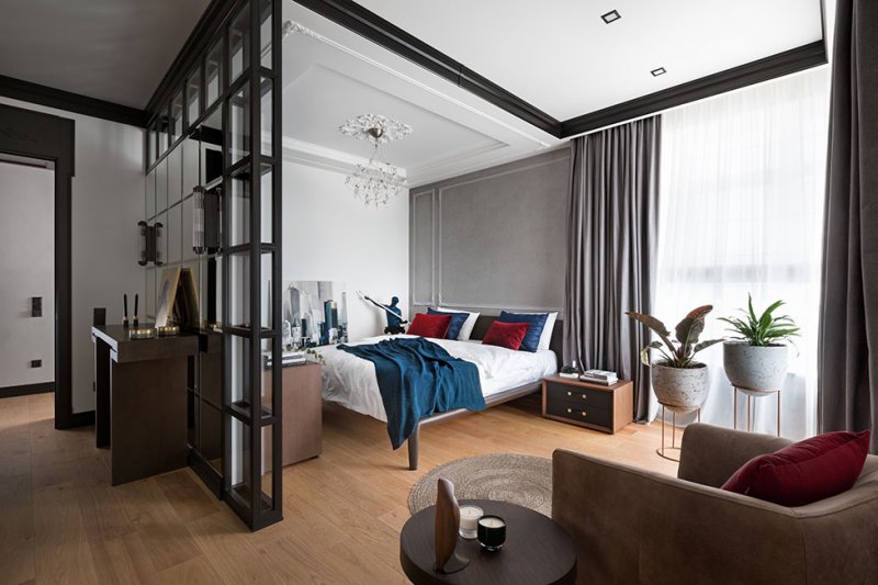 О проекте рассказывают Виктория и Анастасия. «Достоинством исходника стали высокие потолки (3 метра после отделки), большие окна и хорошая конфигурация. Из недостатков можно было отметить много несущих конструкций, в результате чего перепланировка была сведена к минимуму.