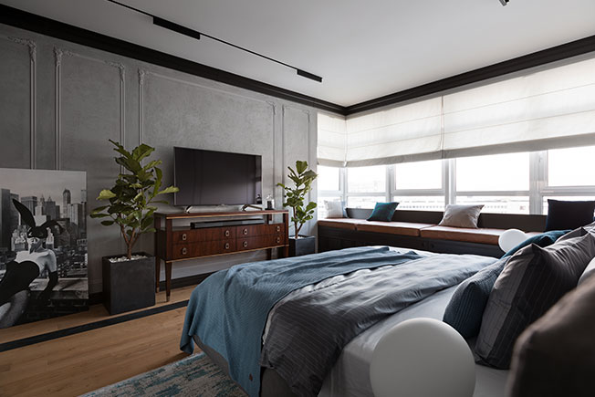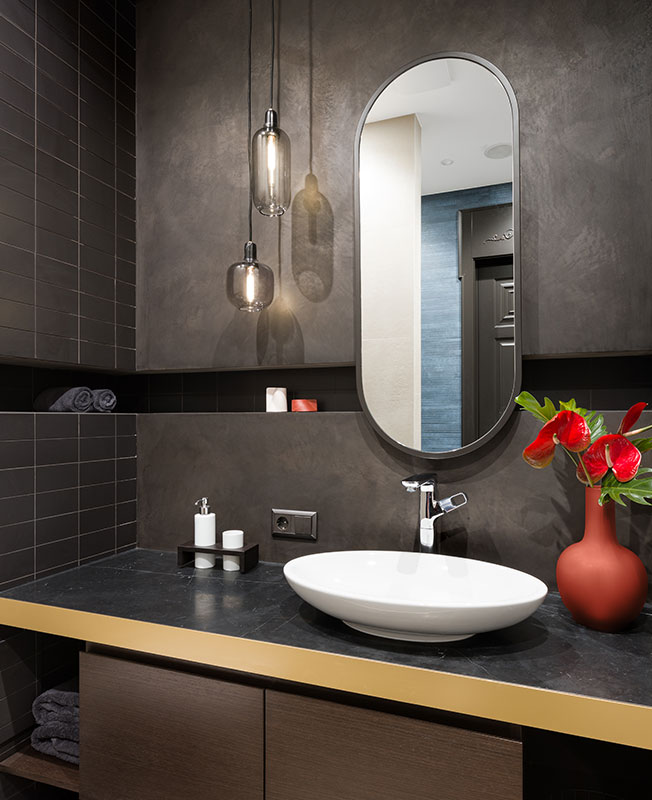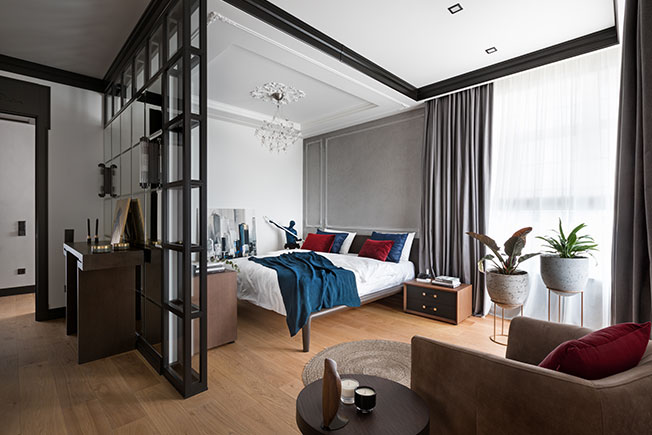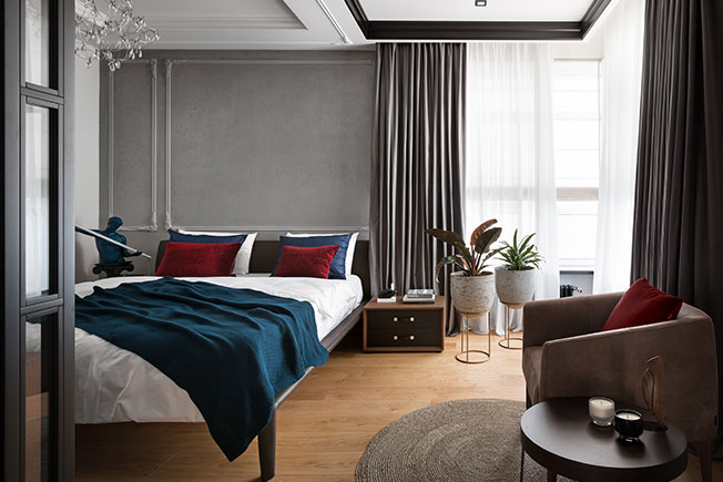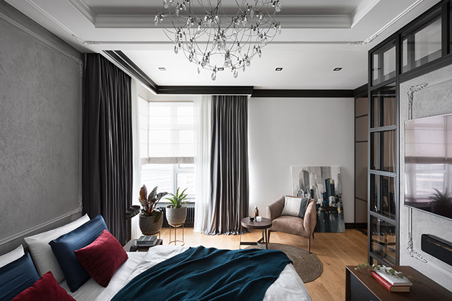 Владелец хотел практически монохромный интерьер, но с яркими аксессуарами, которые заряжали бы его энергией. Пространство в серых и белых полутонах разбавлено цветовыми акцентами: гранатово-винные стены в прихожей, яркий декор и текстиль.