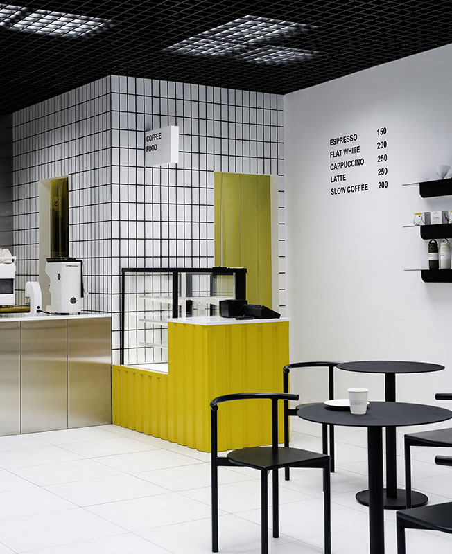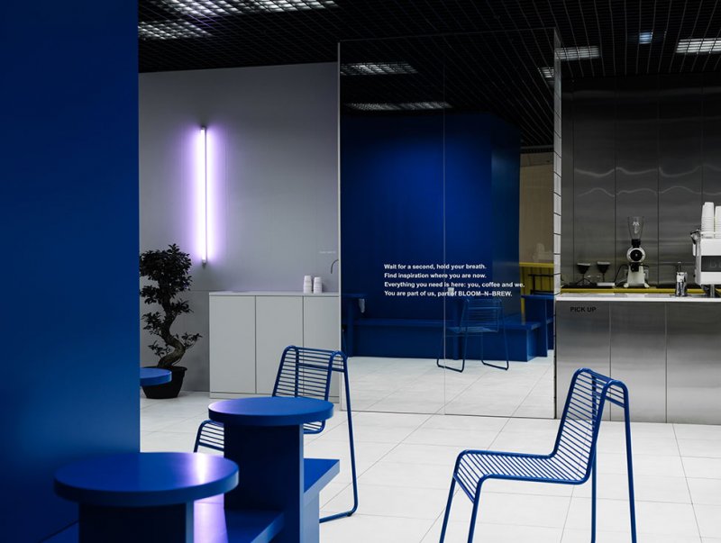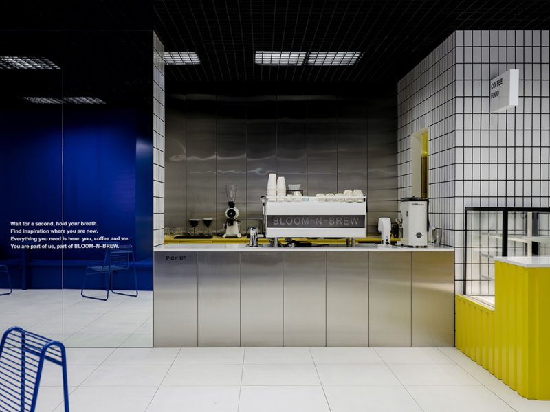 Акцентами в пространстве стали контрастные цвета и графические элементы. На закругленной белой стене можно прочесть философию бренда Bloom-n-Brew, повторенную в зеркальном полотне возле кассовой зоны.