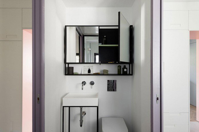 Между двумя маленькими спальнями был встроен санузел. Туалет специально обставлен так, что каждый его элемент был специально рассчитан и изготовлен на заказ (например, основание раковины), чтобы точно использовать все мыслимое пространство.