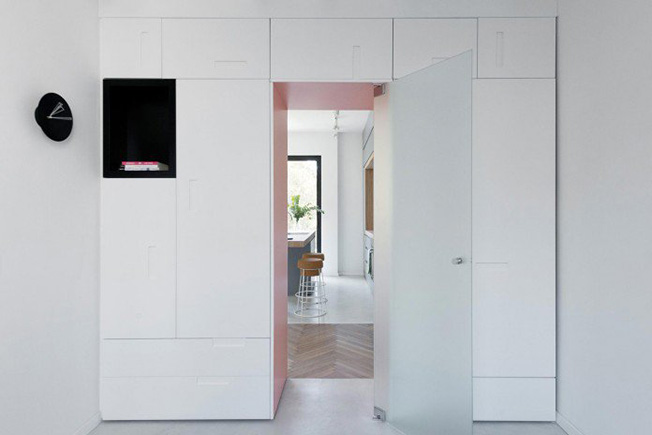 Только две изначальные стены были оставлены, остальные сегодня представляют собой шкафы ручной работы, которые разделяют пространство, скрывая оборудование, утварь, одежду, бытовые приборы. Каждый сантиметр был оптимизирован и придуманы особые «секретные» места для хранения.