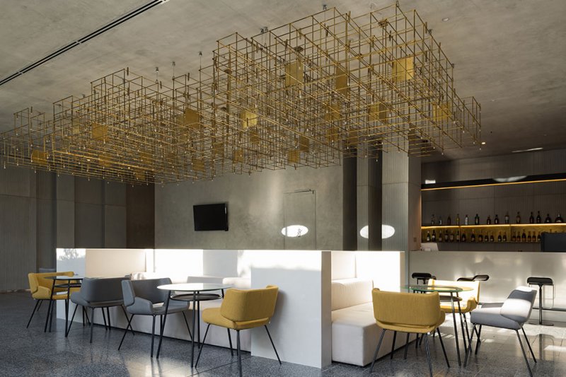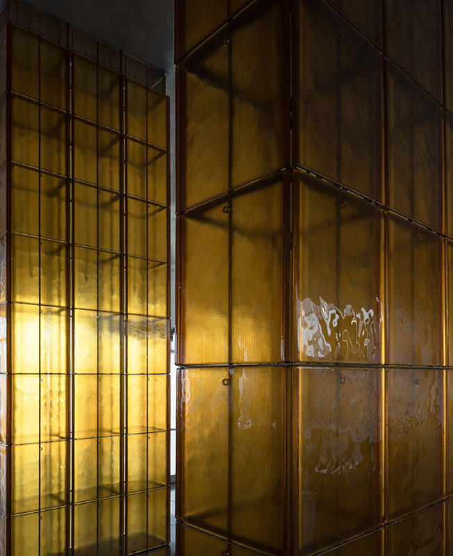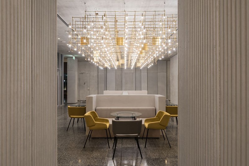 Латунные светильники, а также стеклянные колонны во входном холле — яркий запоминающийся акцент был создан совместно с партнерами Nickel Collective. Блоки мурманского венецианского стекла смонтированы на натянутых тросах и оборудованы интегрированной подсветкой.