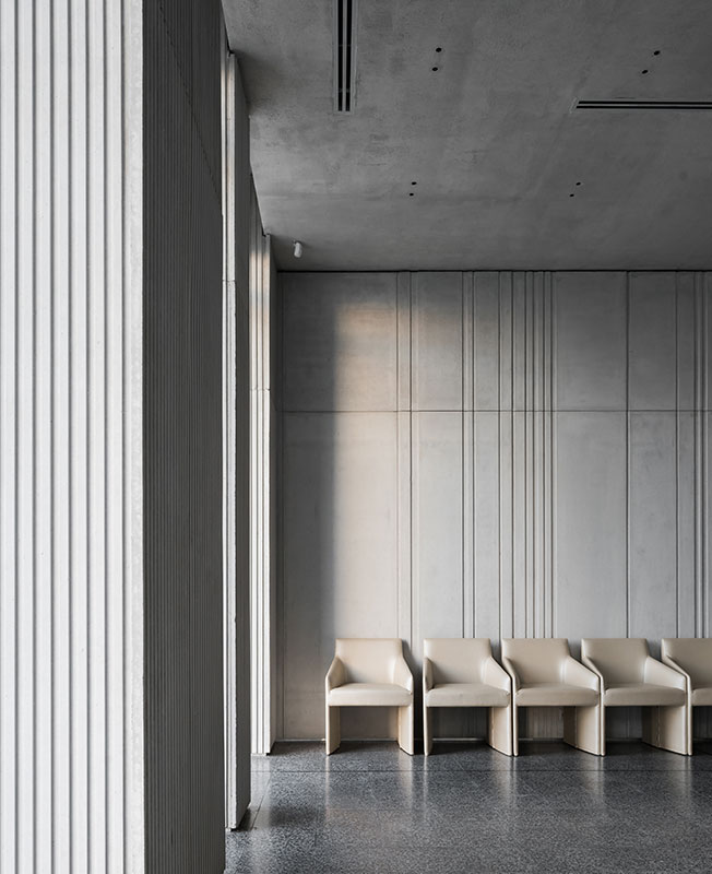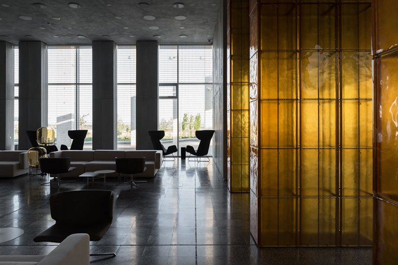 Помимо декоративной роли, колонны также функционально отделяют входную зону от залов ожидания. За счет открытого внутреннего двора в помещение проникает солнечный свет, который при попадании на мурманское стекло создает причудливые карамельно-золотые блики на полу и стенах.