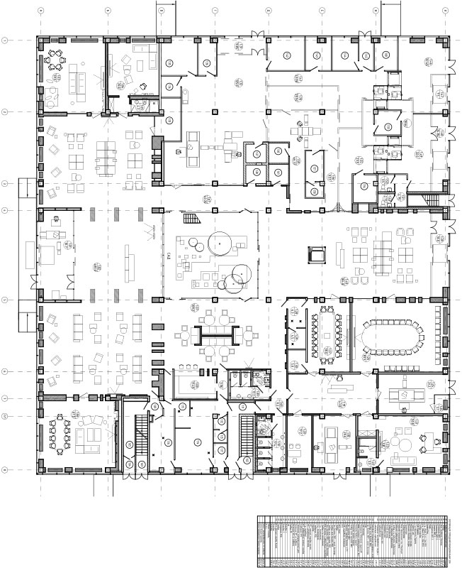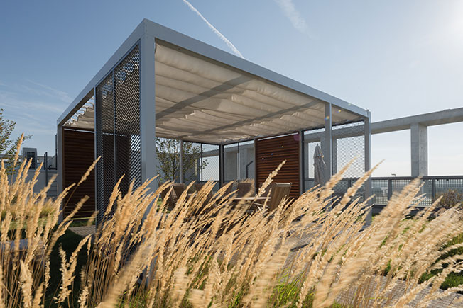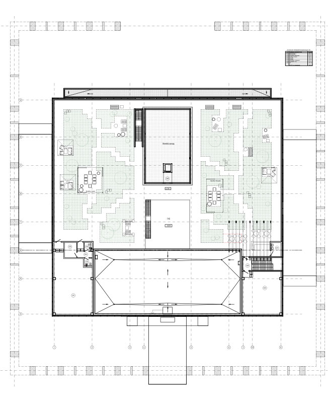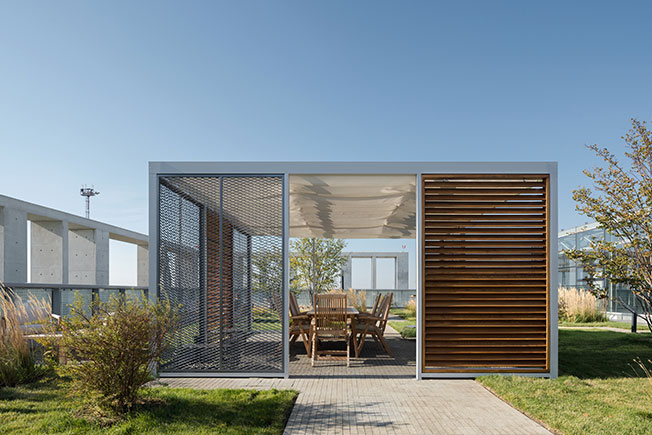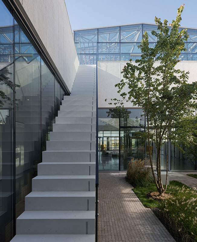 За наружной колоннадой находится стеклянный параллелограмм. В центре объема расположен внутренний двор с лестницей, ведущей на эксплуатируемую кровлю. Здесь расположена открытая площадка с садом, шезлонгами, беседками и баром. Таким образом архитекторы связали воедино интерьер и экстерьер — одно пространство плавно перетекает в другое.