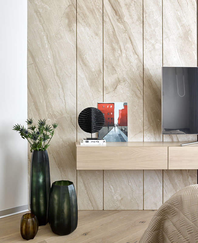 Многие решения в проекте построены на нюансах. Например, в спальне родителей стена за ТВ облицована камнем и шпонированными панелями, при этом их оттенки подобраны очень близко друг к другу — материалы смотрятся гармонично.