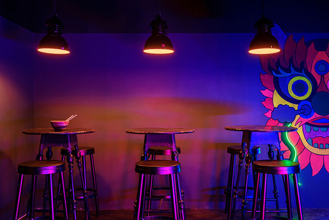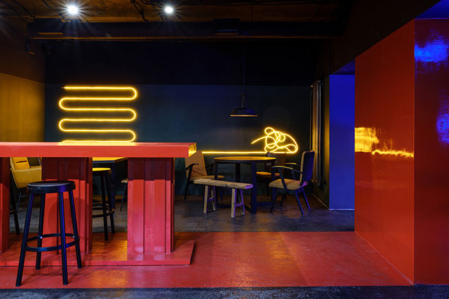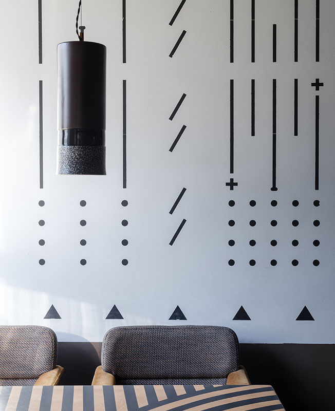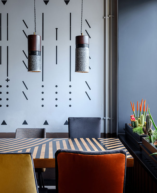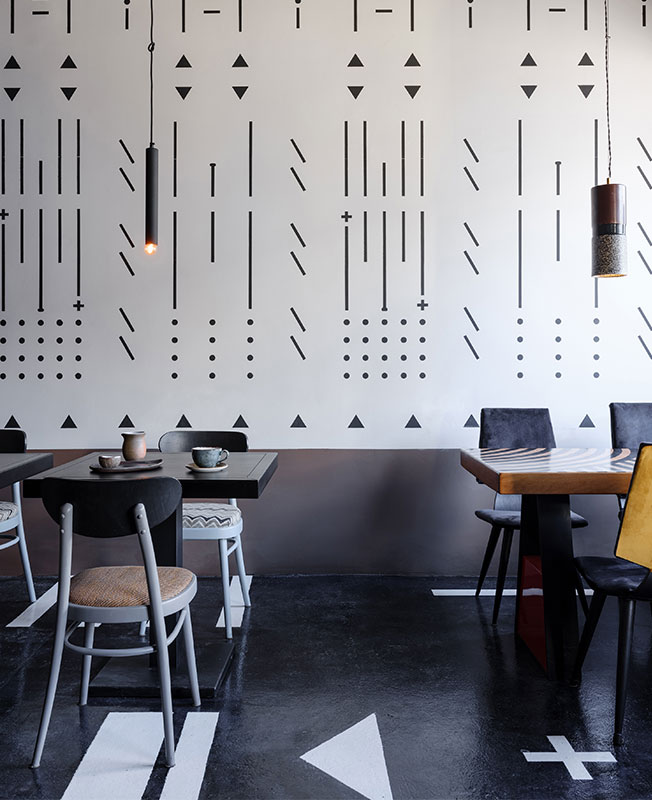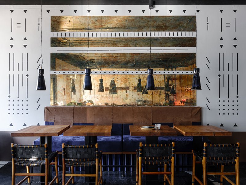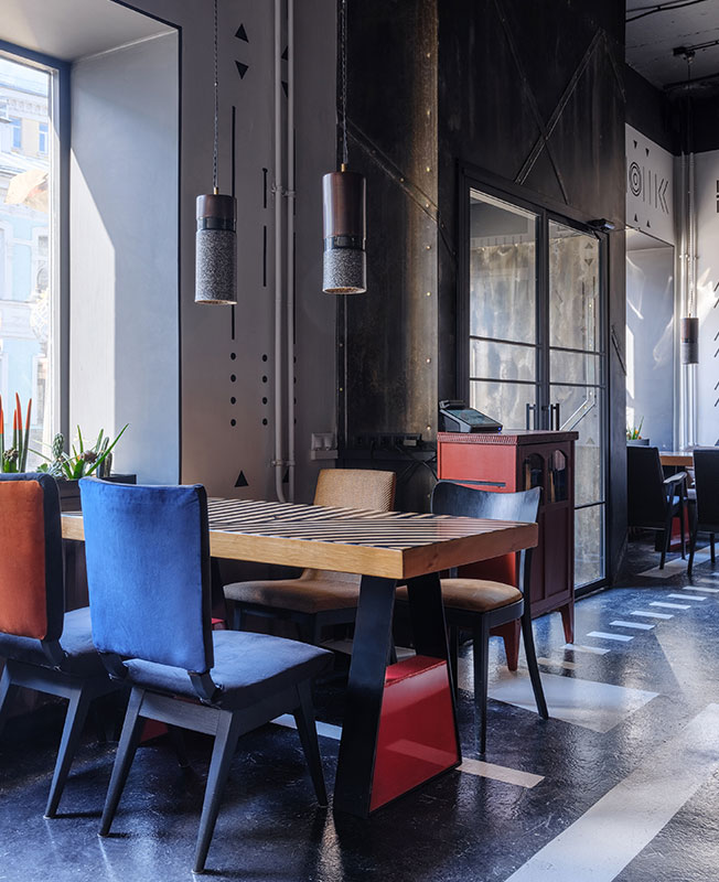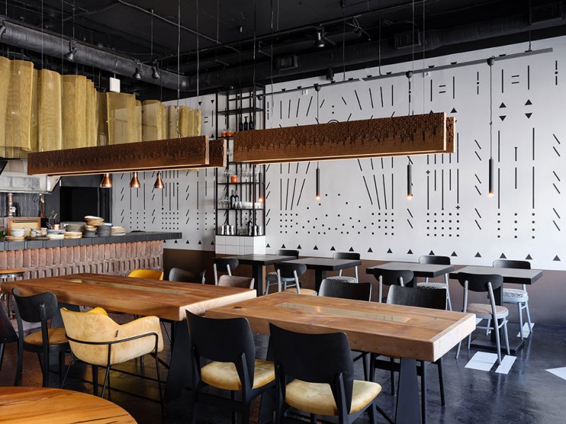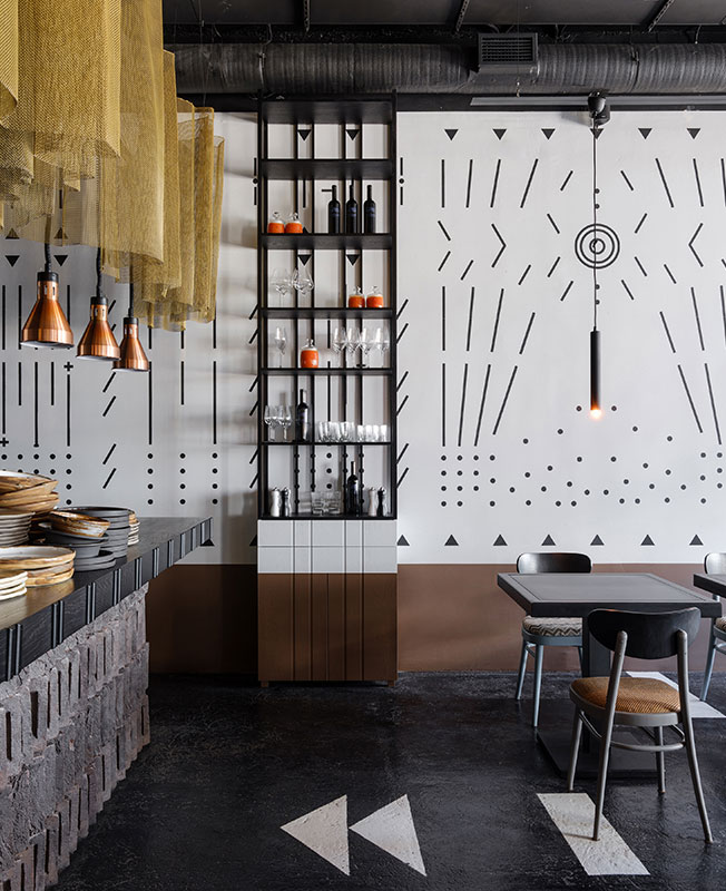 Тем не менее, орнаменты не транслируют этнические идеи напрямую, но пробуждают воображение гостей и вызывают самые разные ассоциации, например, с компьютерными играми. Помимо рисунков на стенах, гостей окружает огромное количество элементов и деталей, которые интересно разглядывать в ожидании заказа — светильники, графичные элементы на столах, оригинальный пол — помещение насыщено геометрией, цветами и фактурами.
