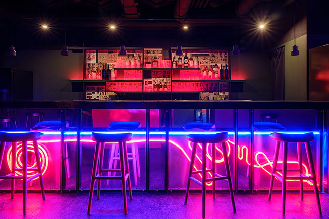 Главным недостатком исходного помещения авторы отметили, что на первом североамериканском этаже невозможно было оборудовать санузлы — их пришлось перенести на цокольный уровень. Здесь гостей поджидает главный сюрприз. Спустившись, посетители попадают в зону бара, оформленную в совершенно ином настроении.