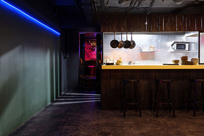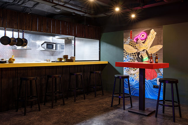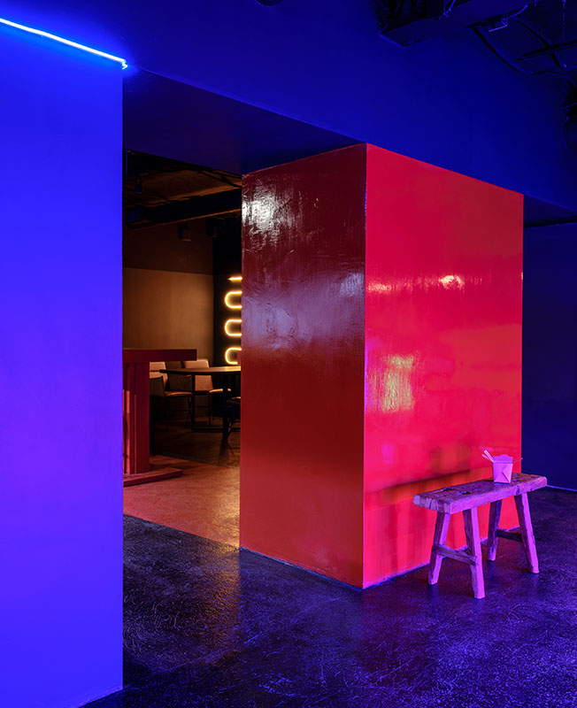 Идея кардинального разделения родилась из простого отсутствия окон на нижнем этаже ресторана. На цокольном уровне царит атмосфера южноамериканского подземного города, а многочисленный неон навевает мысли о ночной азиатской жизни. Заведует здесь перуанской кухней и напитками шеф-бармен Кенан Ассаб. Главные акценты интерьера — японские принты с ироничными деталями. В интерьере даже появился дракон — его собственноручно нарисовала на стене Наталия Чайка.