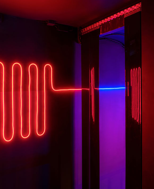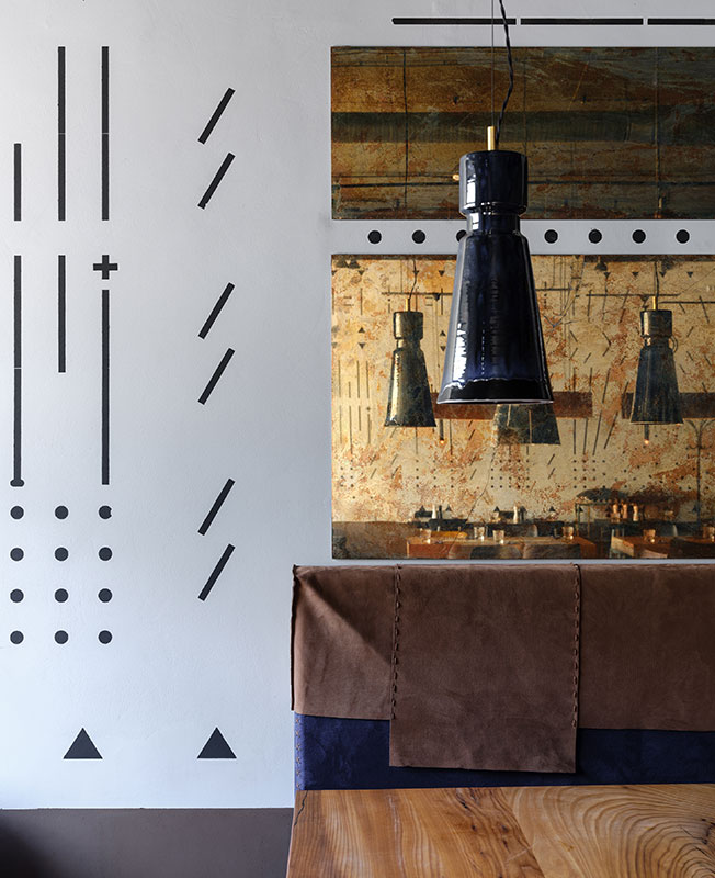 Одним из самых удачных решений в интерьере как раз стал пол. Обычную стяжку тонировали в черный цвет и покрыли эпоксидным лаком. Для нанесения символов использовали краску для дорожной разметки со светоотражающими частицами. «По сути, мы привели улицу в помещение, это требовалось, чтобы этнические мотивы не смотрелись чужеродно в современном городе», — рассказывают дизайнеры.