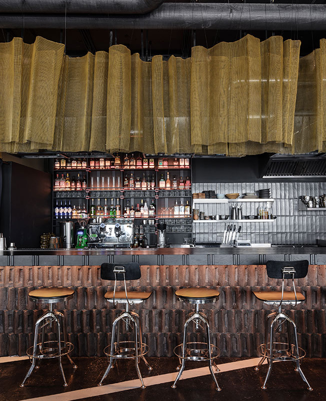 Дизайнеры с особым вниманием подошли и к выбору обстановки для двух уровней ресторана. «Можно сказать, что все предметы сделаны на заказ. Диваны не только поддерживают концепцию заведения, но и зонируют помещение, отделяя зону высокой посадки от низкой. Графичные столы реализованы из массива древесины. При выборе тканей отталкивались от тактильности — остановились на материалах, которые напоминают ворс животного, кожу, замшу. На первом этаже поставили винтажные стулья, отреставрированные мастерской «Дока-мебель».