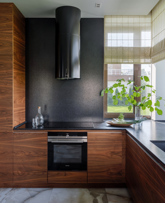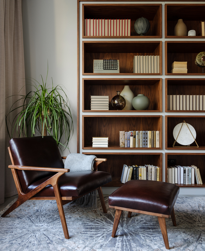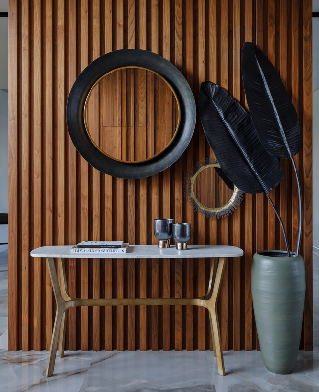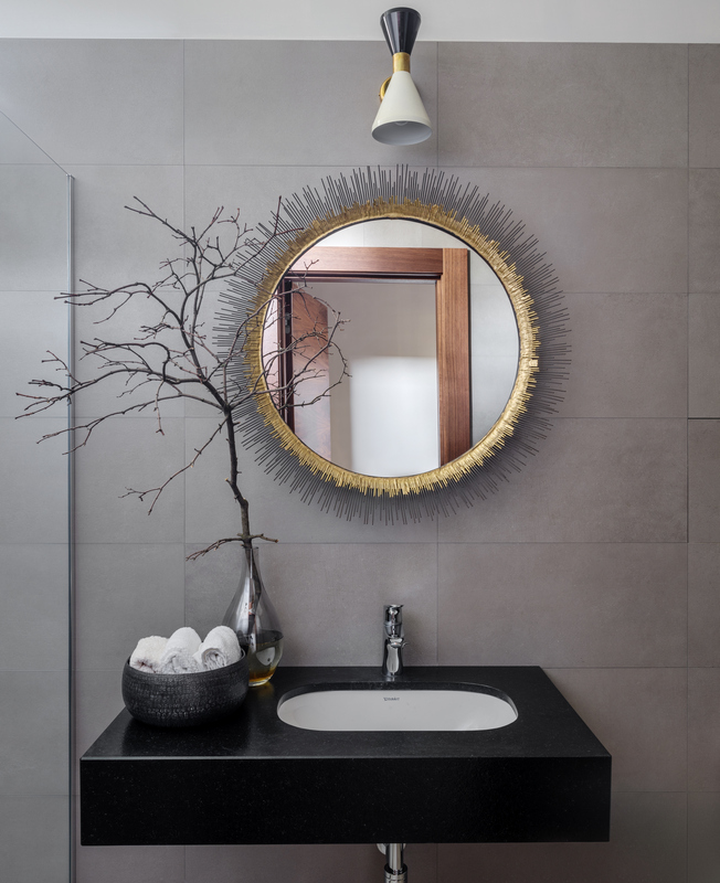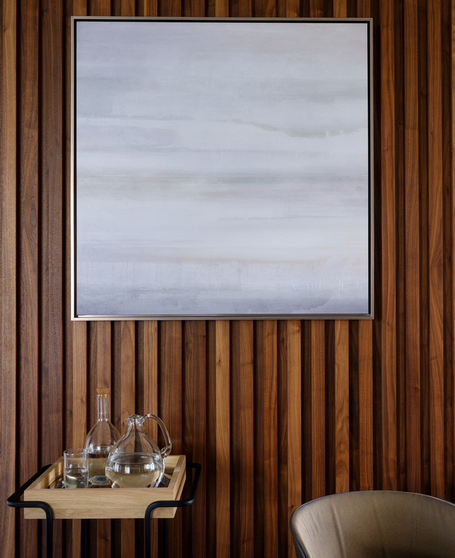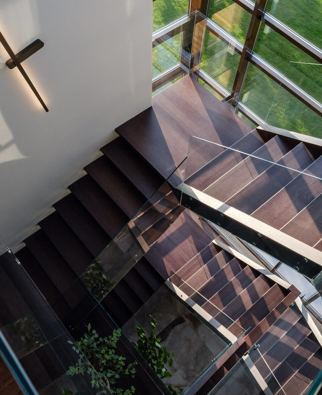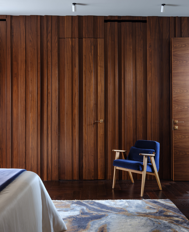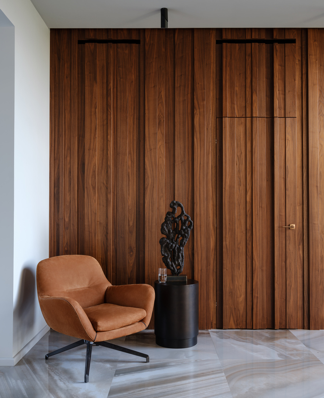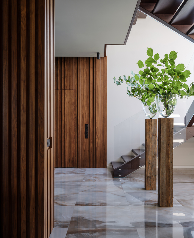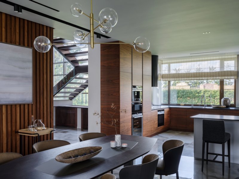 На первом этаже нет четкого деления пространства — комнаты плавно перетекают друг в друга, даже кабинет отделен лишь прозрачной стеклянной перегородкой. Изолированы только гараж, котельная и гостевой санузел, но при этом двери в технические помещения скрыты за панелями из американского ореха. Через древесину дизайнер связала экстерьер и интерьер дома — планкен на фасаде и рейки внутри.