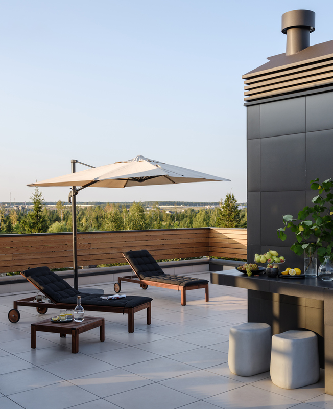 Дополняет атмосферу вечного отпуска терраса на эксплуатируемой кровле. Здесь разместили компактную кухню и оборудовали душ для принятия солнечных ванн или вечеринок под луной.