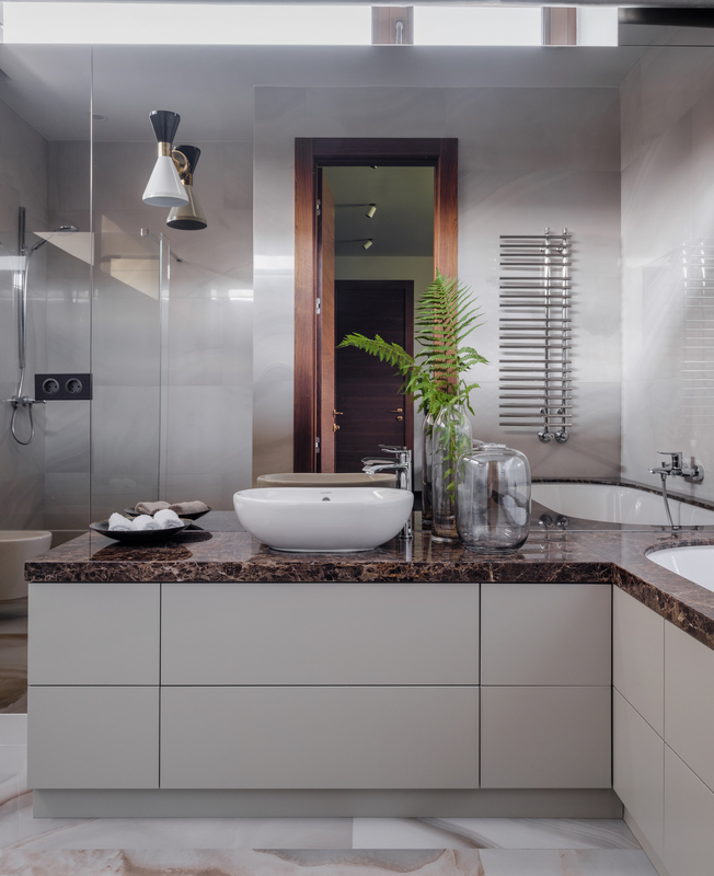 Дизайнер хотела создать интерьер в духе весеннего утра — на это работают цветовая гамма и натуральные материалы. В палитре теплые природные оттенки (бежевый, коричневый) сочетаются с более холодными (серый и темно-синий). В отделке преобладает керамогранит (на первом этаже), мрамор и натуральная древесина — тон всему второму этажу задает паркет «французская елка».