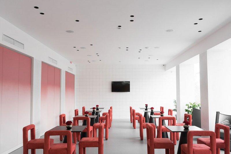 Перед дизайнером стояла задача создать интерьер-трансформер, который позволил бы легко менять пространство под разные задачи и функции: лекционный зал, коворкинг, выставочная галерея.