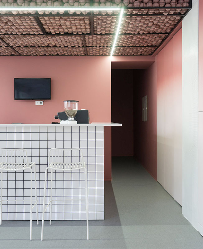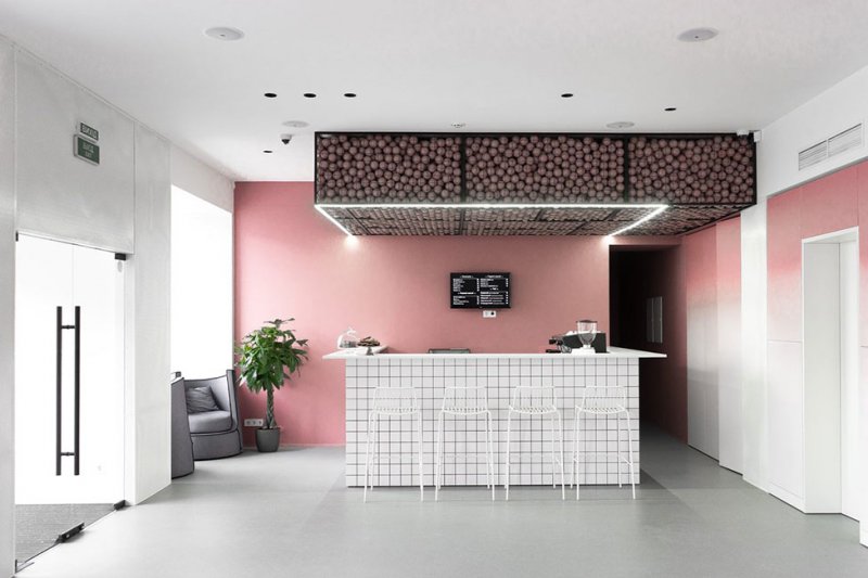 Акцентом лаконичного помещения стали терракотовые стулья Toptun и уютные кресла-коконы Lono украинской марки Faina (основатель — Виктория Якуша). Завершают образ невесомые розовые панели, окрашенные градиентом и словно растворяющиеся в пространстве.