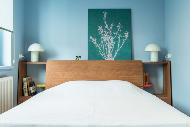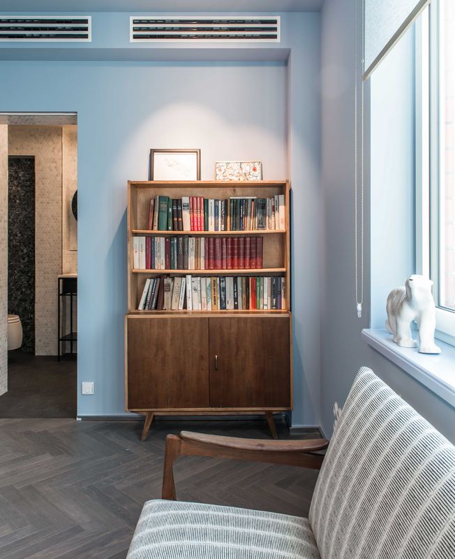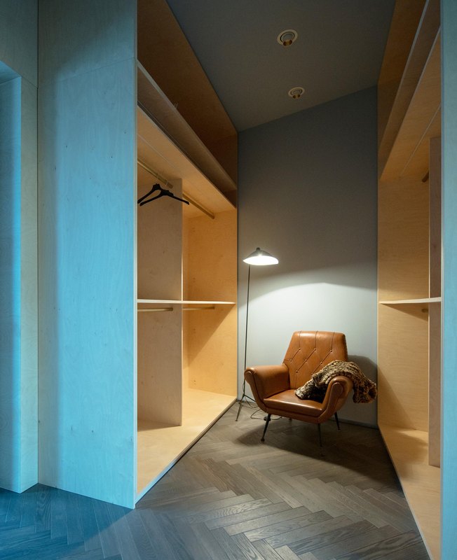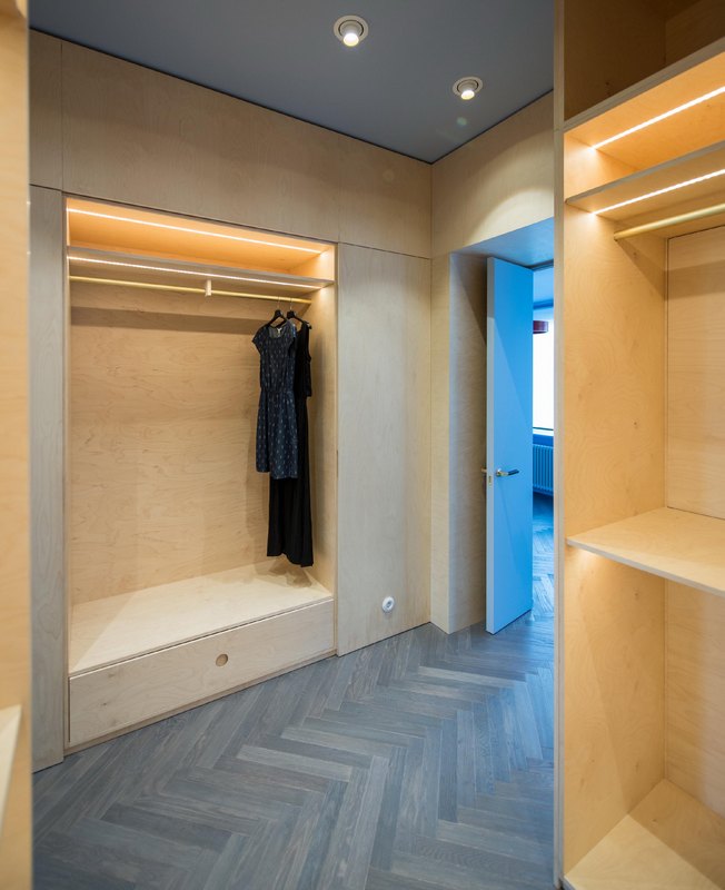 Для этого дизайнеры придумали перегородку, состоящую из одинаковых створок-ячеек. Часть из них стеклянные (кухонные), ведущие в спальню — глухие. Переход из общественной зоны в частную акцентирован цветом: зона гостиной — белая, спальни — голубая. Идею разделения пространства также поддерживает и паркетная доска, которая меняется от оттенка натурального дуба к тонированному серо-голубому.