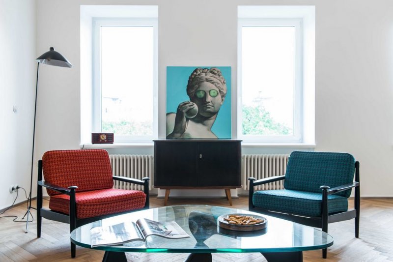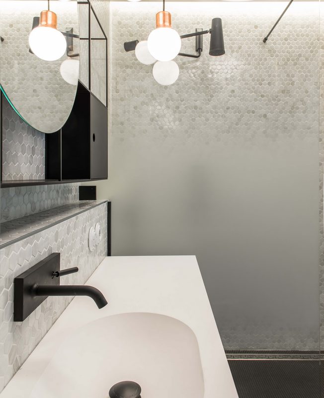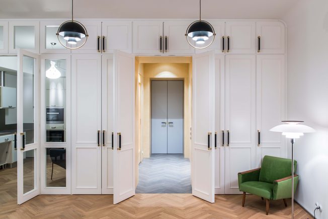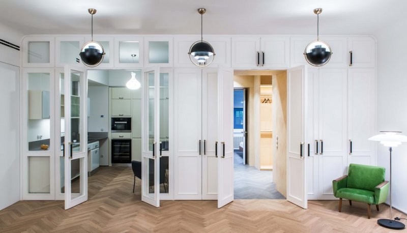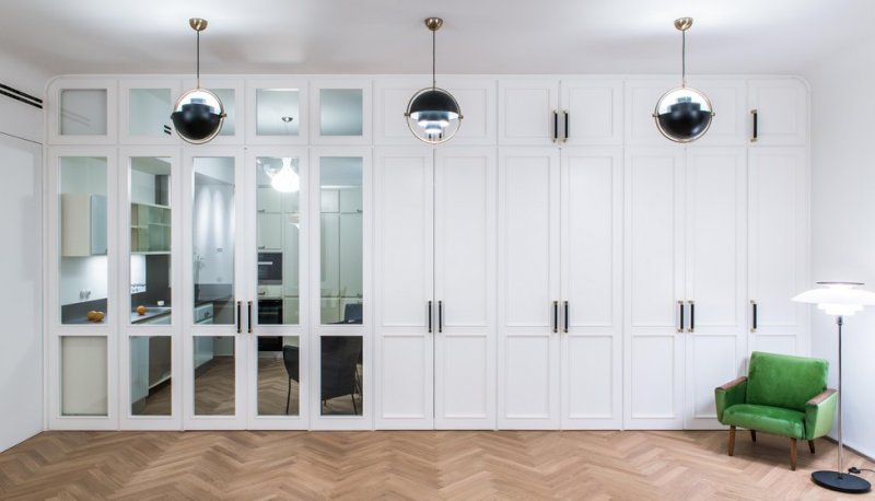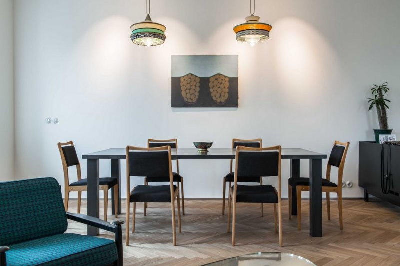 В интерьере большое внимание уделено светильникам. Например, в гостиной три подвесных светильника марки Gubi от Луиса Вайсдорфа выделяют проход в кухню, при этом центральный подсказывает гостям, куда можно повесить верхнюю одежду. Здесь же возле зеленого кресла расположен культовый торшер PH80 фабрики Louis Poulsen по дизайну Поула Хеннингсена. А в центре помещения находится настоящая классика дизайна — придуманный в 1950-е годы светильник Сержа Муя. Этот лаконичный объект был создан французским проектировщиком как ответ яркому итальянскому промдизайну.