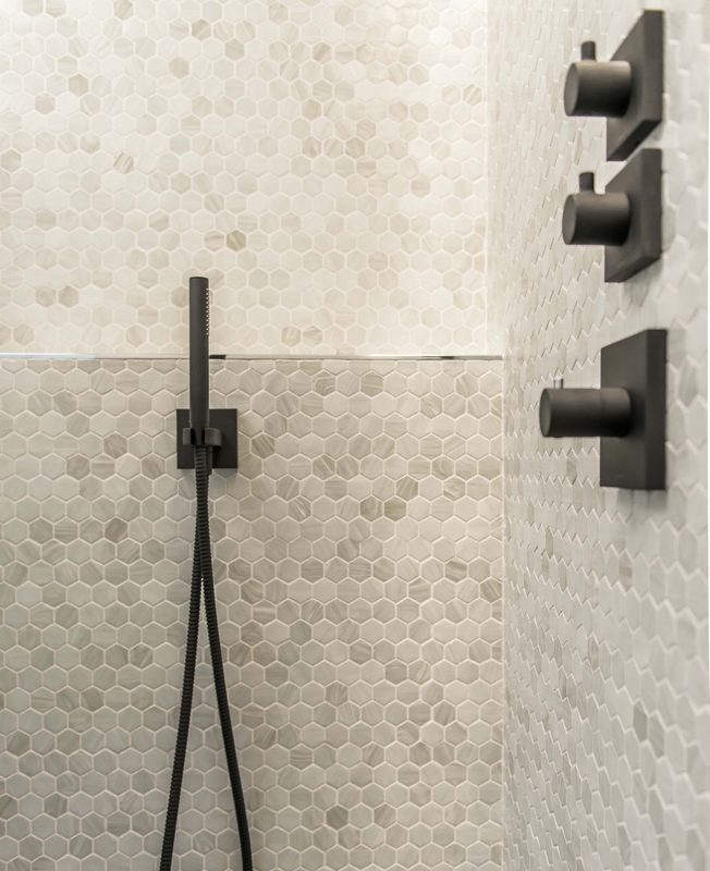 В отделке светильников, мебели, дверных ручек, в стыках между паркетом и плиткой использовалась латунь. Плинтус во всей квартире сделан из полированной профильной трубы. Часть фартука и столешница на кухне также изготовлены из нержавеющей стали, но в матовом исполнении. Большая часть мебели советского периода раньше принадлежала бабушке заказчицы и была специально отреставрирована для новой квартиры.