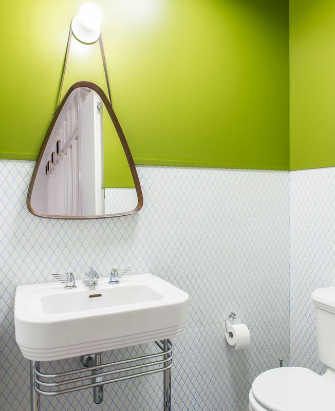 В проекте много нюансов. Закругленные потолки напоминают об эстетике 1960-х годов XX века. Дверь в гостевой санузел выкрашена в цвет стен, у нее нет наличников и ручки, а внутри гостей встречает ярко-зеленый цвет Citrine из палитры Little Greene.
