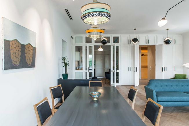 Квартира 103 кв. метра расположена в пятиэтажном кирпичном доме 1917-го года постройки в районе Патриарших прудов. В 1990-е годы со стороны двора к зданию на все этажи была пристроена просторная закрытая лоджия. Пространство трехкомнатной квартиры переосмыслили Максим Лагутин и Аля Пекина (бюро Воздух). Главным пожеланием заказчиков был светлый, просторный интерьер в стилистике 1950-1970-х годов.