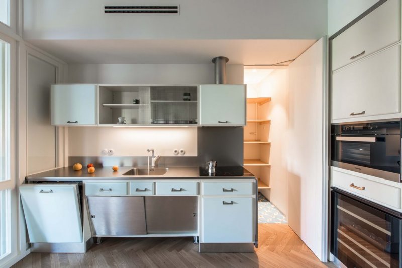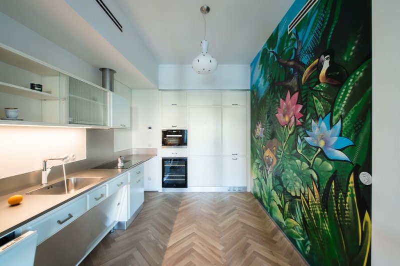 Кухня за стеклянной перегородкой состоит из двух частей: зоны для готовки и хранения со встроенными высокими шкафами, холодильником, духовым шкафом и винным холодильником. Часть столешницы откидывается и за ней обнаруживается потайная дверь, которая ведет в подсобное помещение, где расположены стиральная и сушильная машины, а также открытые полки. Визуальная доминанта помещения — яркое граффити по мотивам картин французского художники-примитивиста Анри Руссо.