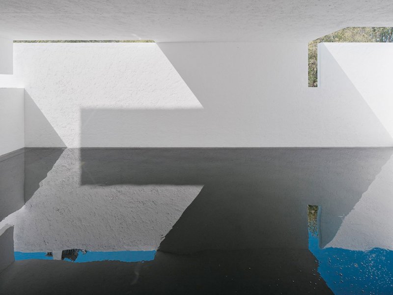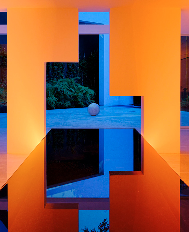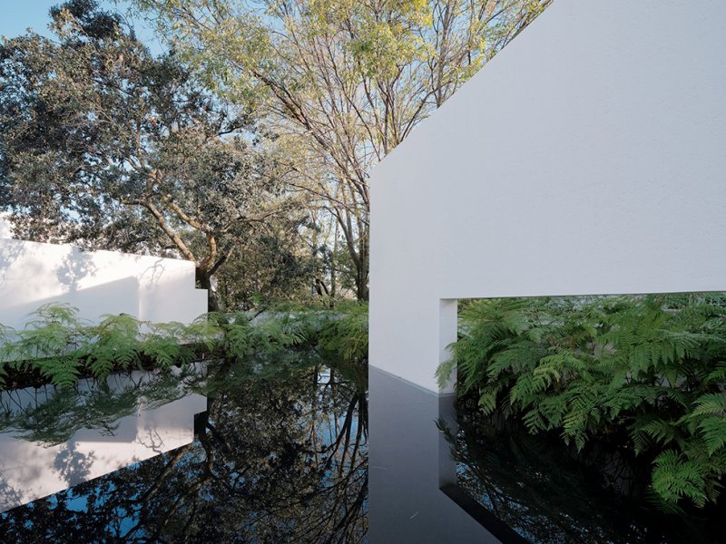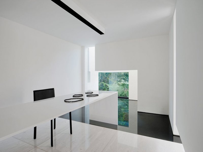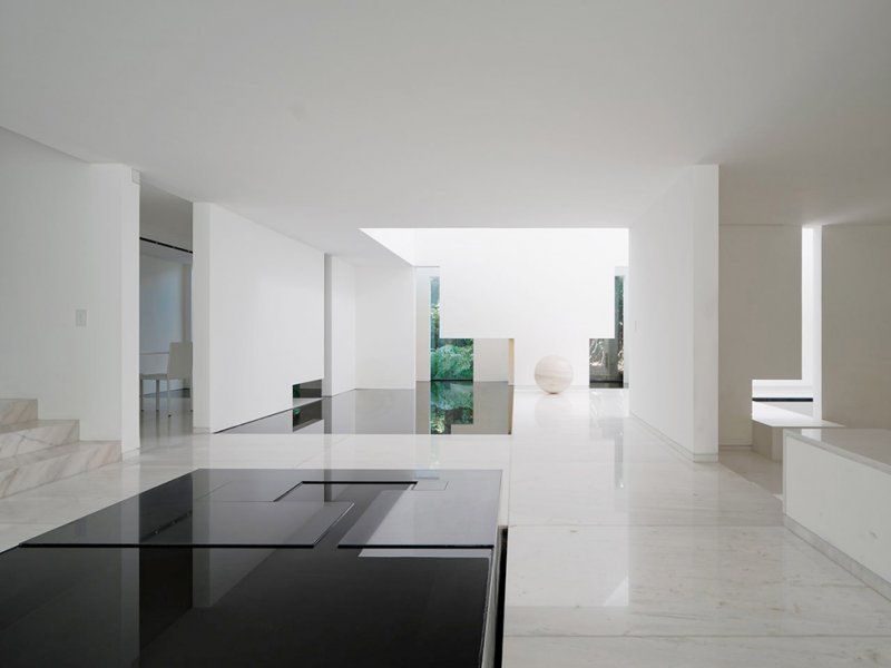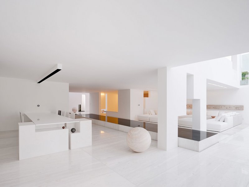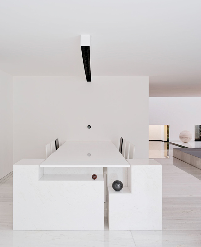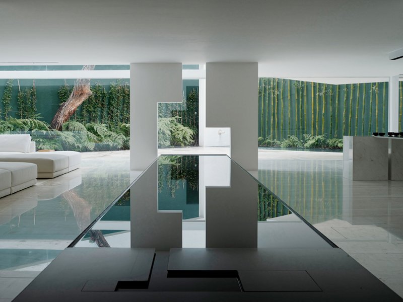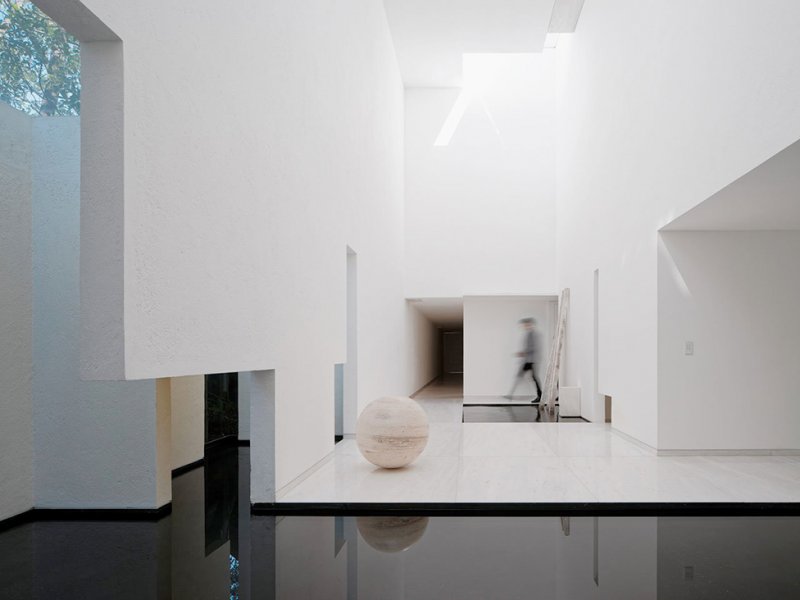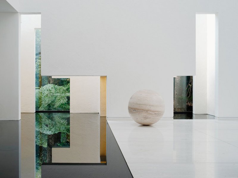 Вместе с многочисленными колоннами, парапетами и встроенной мебелью эти прорези превращают дом в подобие кубистской скульптуры. Эффект усиливает преобладающий белый цвет отделки, а также присутствие декоративных каменных сфер и отражающих поверхностей — зеркальной полировки и водоемов, которые настраивают на созерцательный, медитативный лад и позволяют «впустить» в интерьер зелень с улицы.