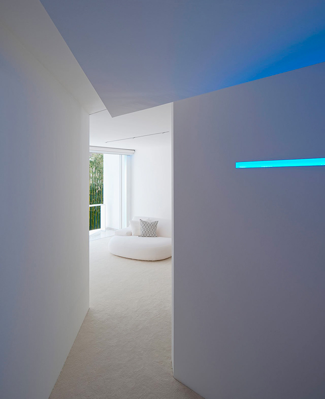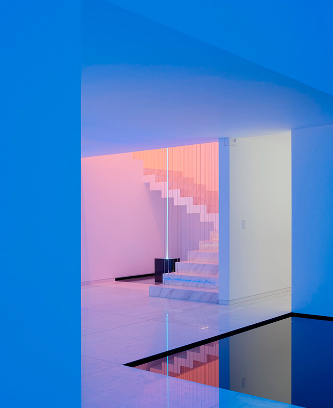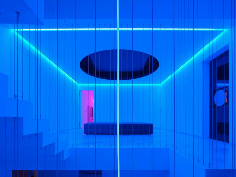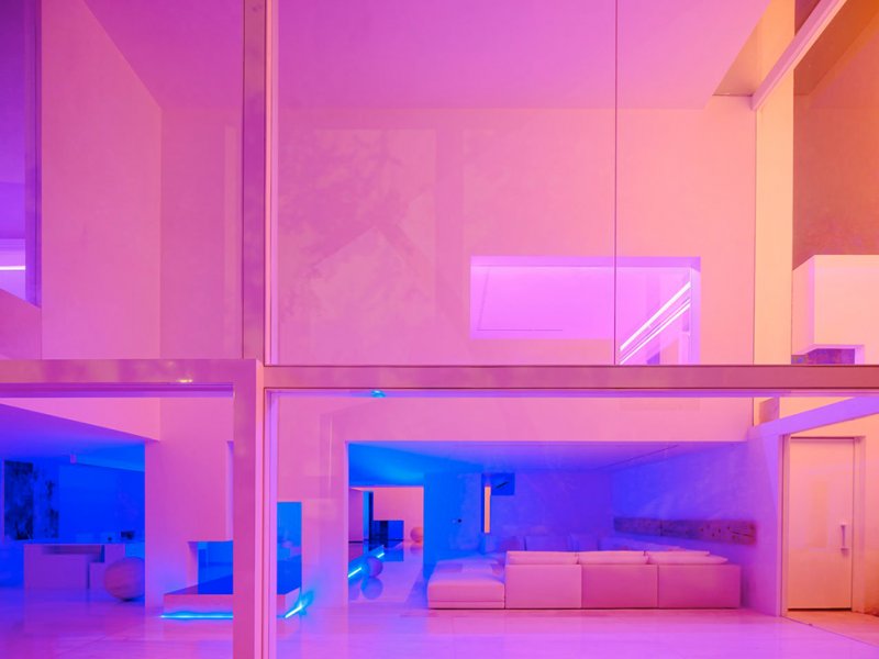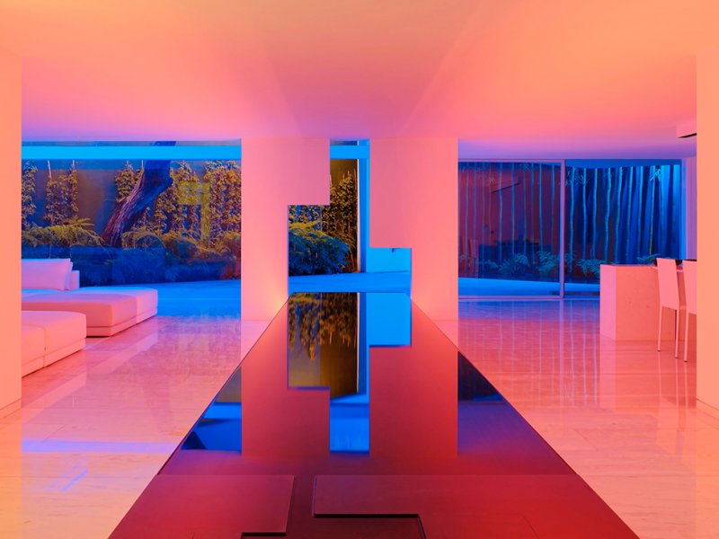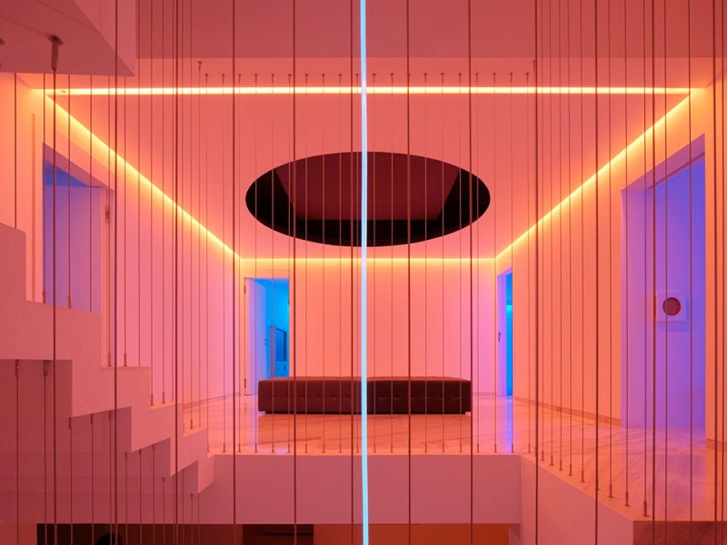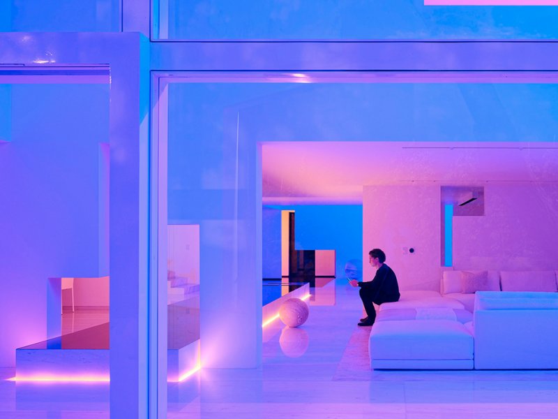 Яркие голубые, оранжевые, фиолетовые, розовые и красные оттенки освещают комнаты и заставляют окна сиять изнутри. Разноцветные огни, которые напоминают работы таких художников, как Джеймс Таррелл и Дэн Флавин, приглашают обитателей дома иначе взаимодействовать с привычным пространством. Кроме того, смена цветовых сценариев позволяет интерьеру подстроиться под настроение жильцов: успокоить или зарядить энергией, создать ощущение прохлады или тепла.